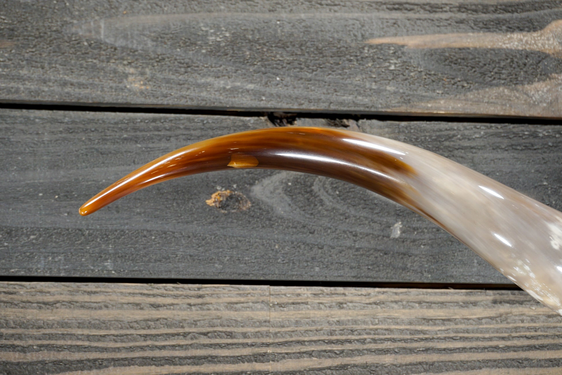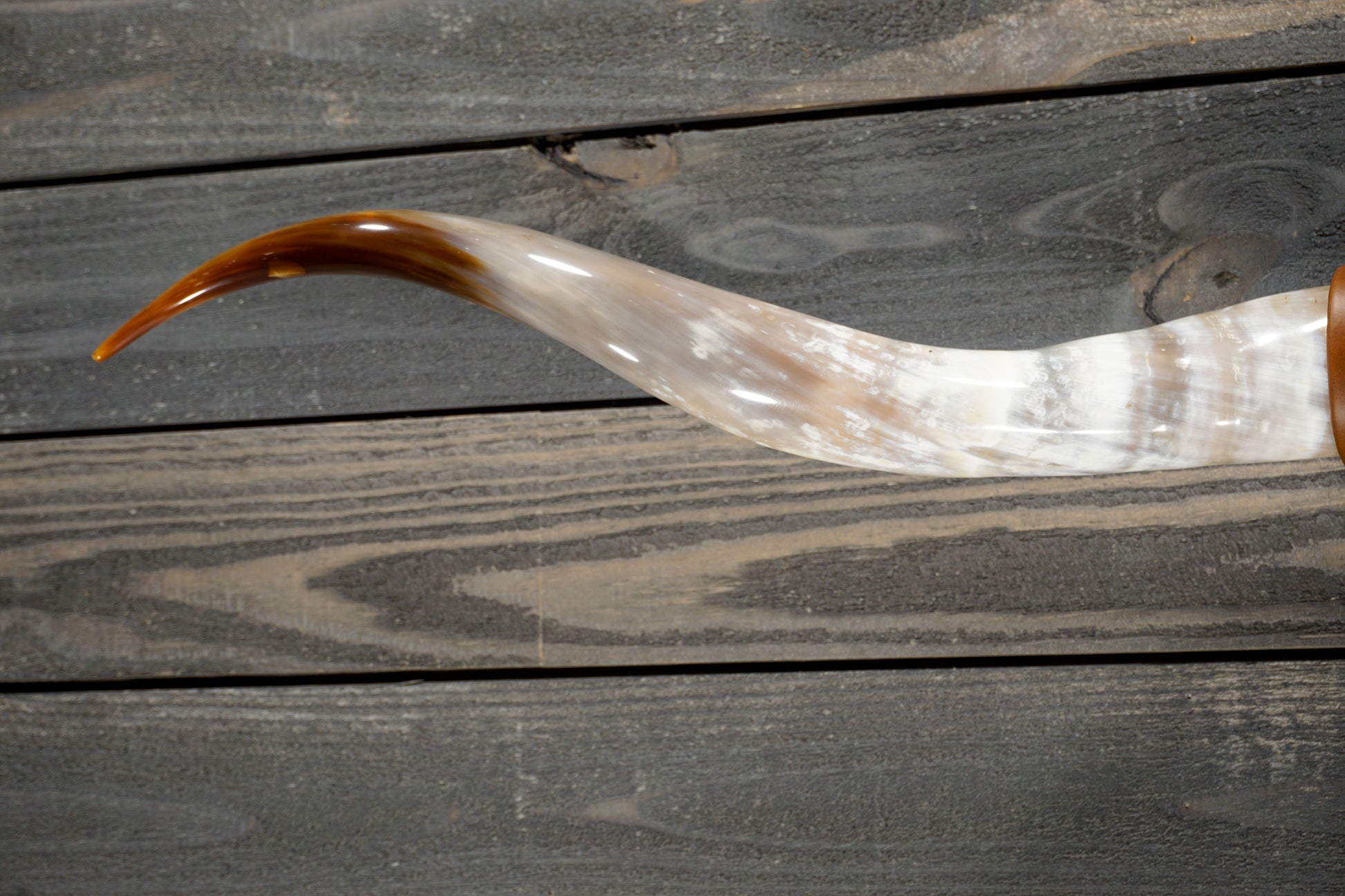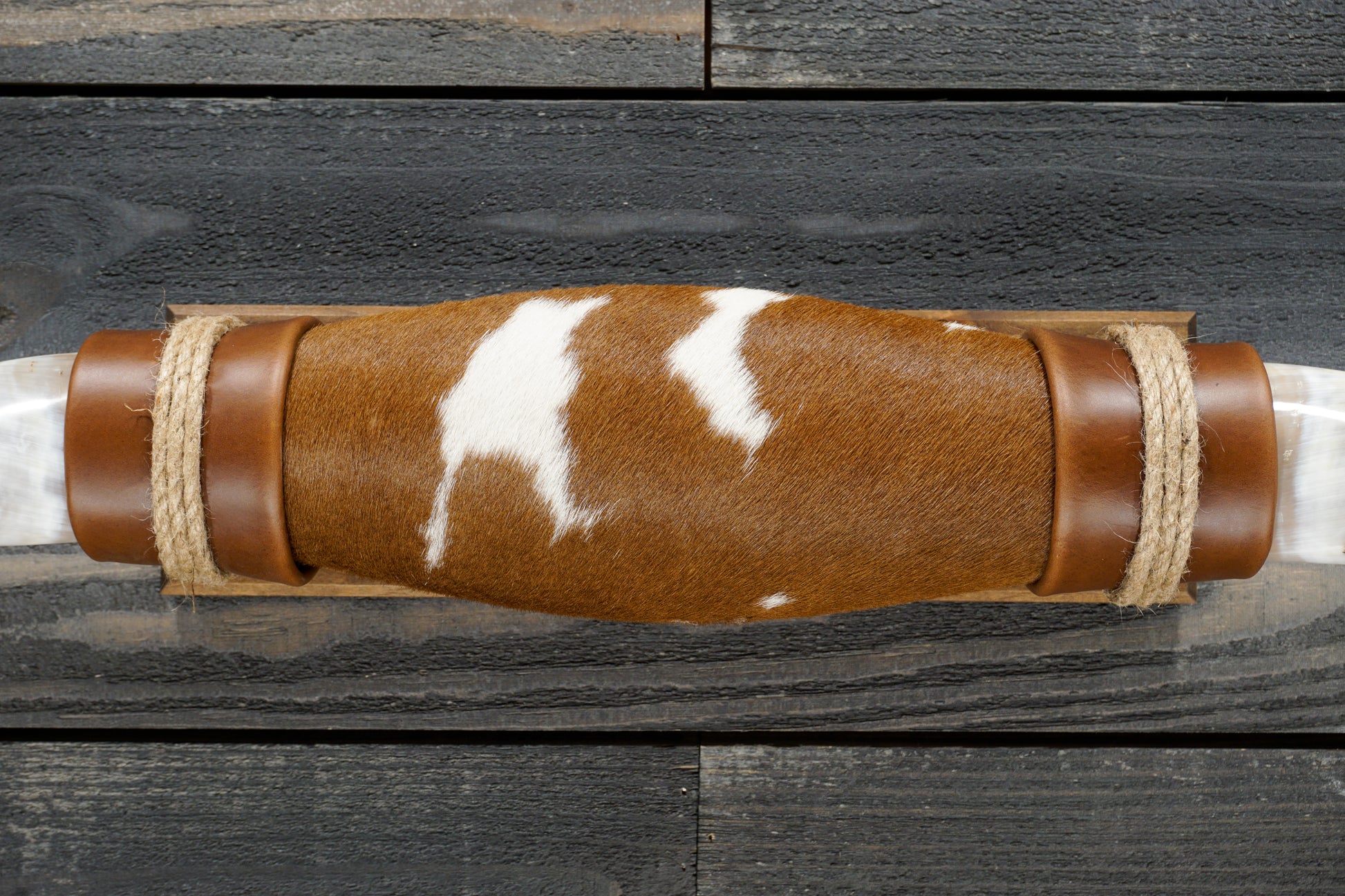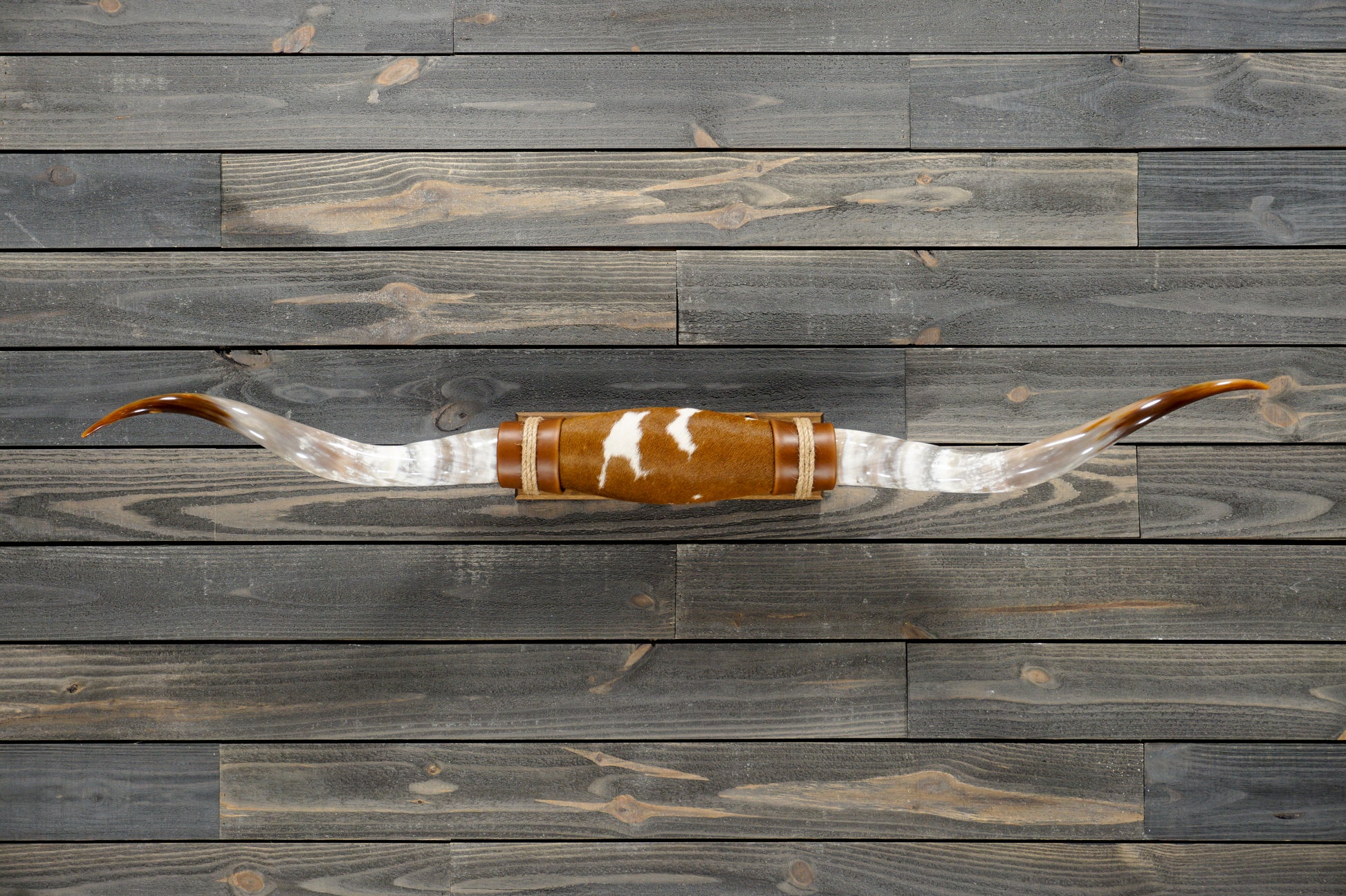 This set of longhorns measures 58 inches wide tip to tip. Each horn measures 23 inches and are hand sanded to a gloss finish. The center is wrapped in brown and white cowhide with pecan leather trimmed with rope.
