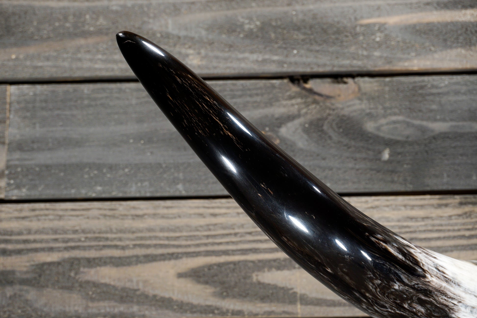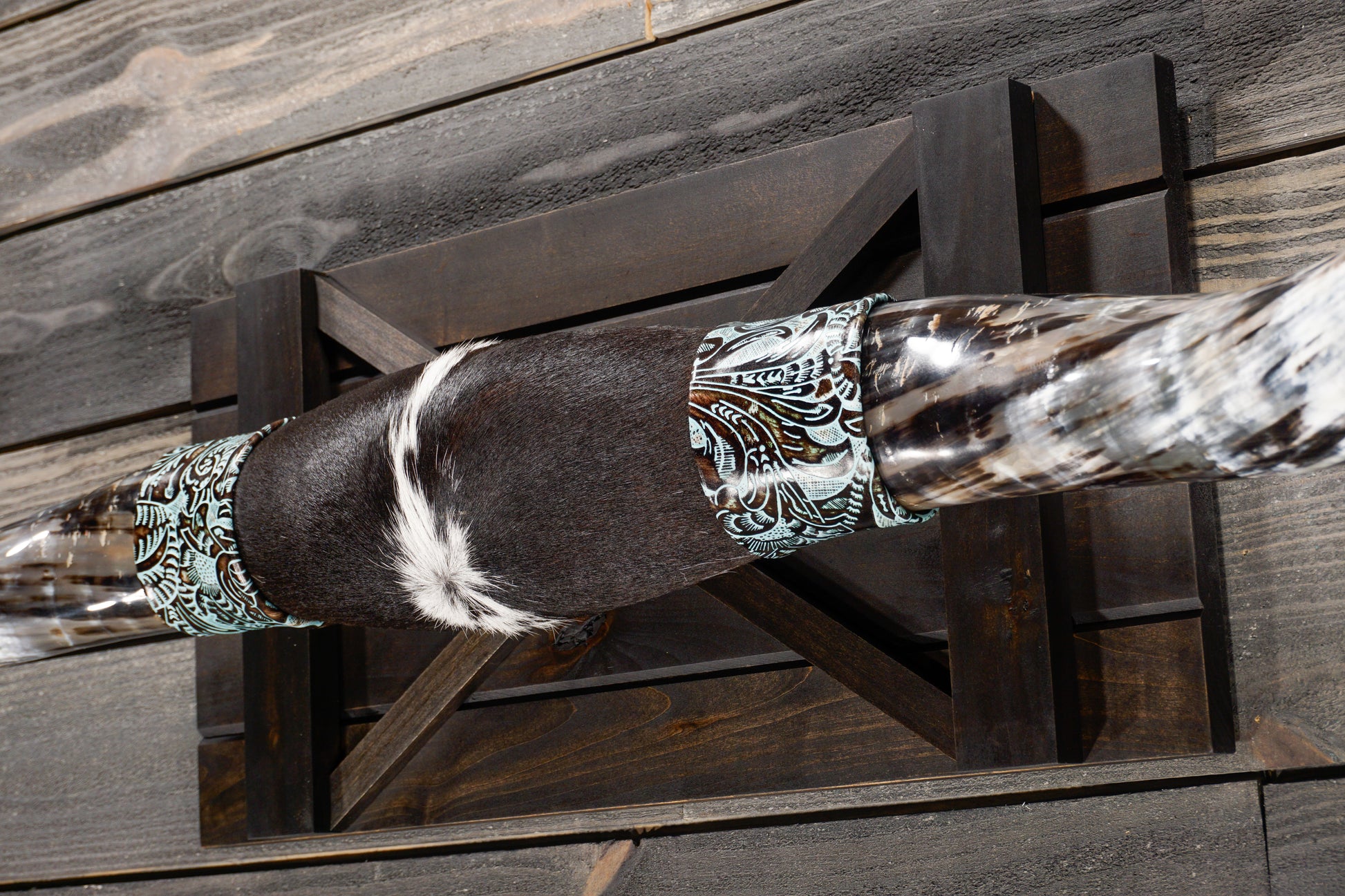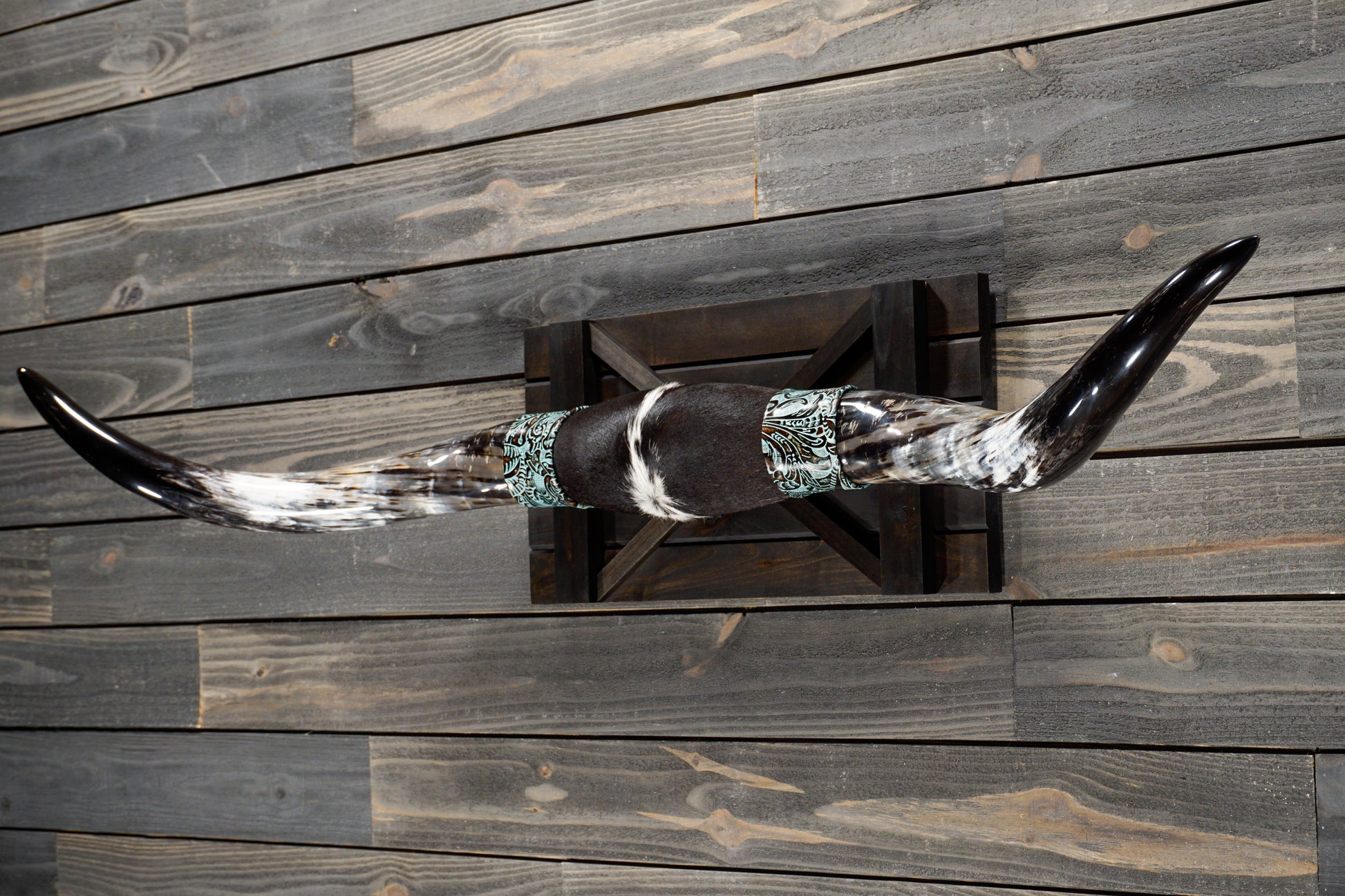 This set of longhorns measures 59 inches wide tip to tip. Each horn is 24 inches long and is hand sanded and polished to a gloss finish. The leather cuffs are made from turquoise western embossed leather. The barn door style mounting plaque is made of knotty alder.