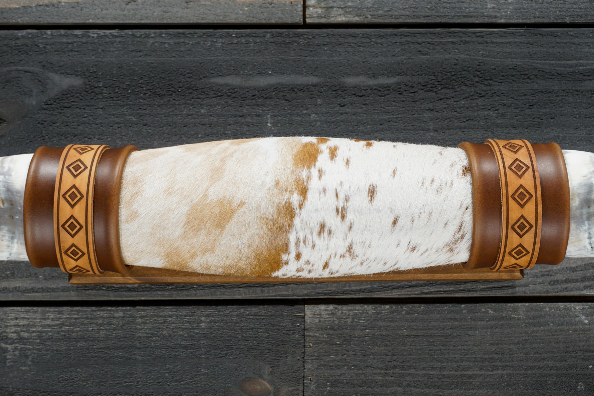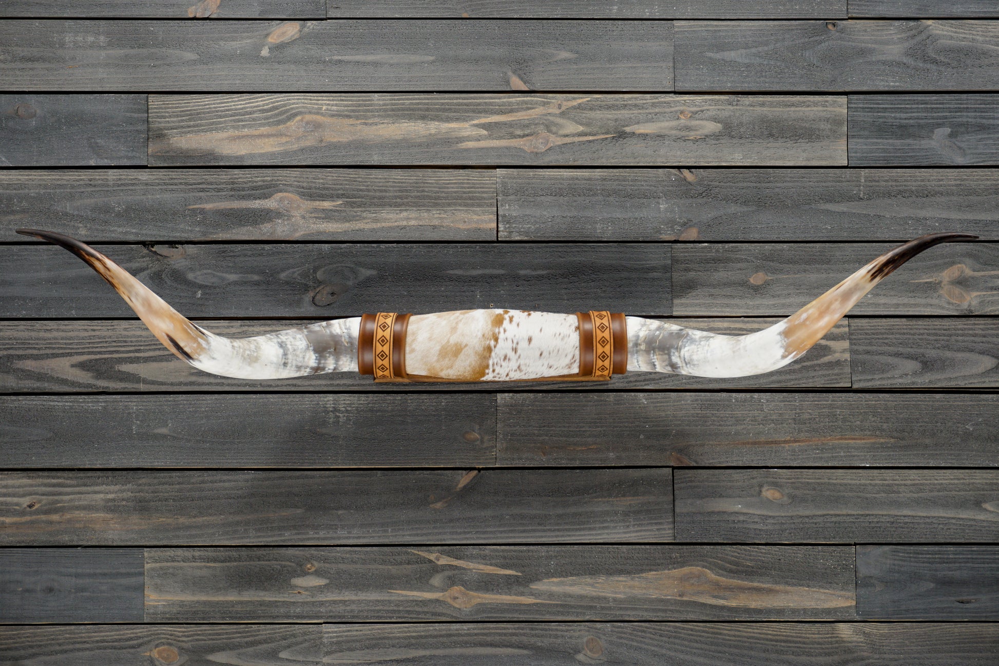 This set of longhorns measures 59 inches tip to tip with each horn measuring 25 inches tip to base. The horns are hand sanded and polished to a satin finish. The center is wrapped in brown and white longhorn cowhide and brown leather cuffs. The mounting plaque is made of knotty alder with a satin finish.