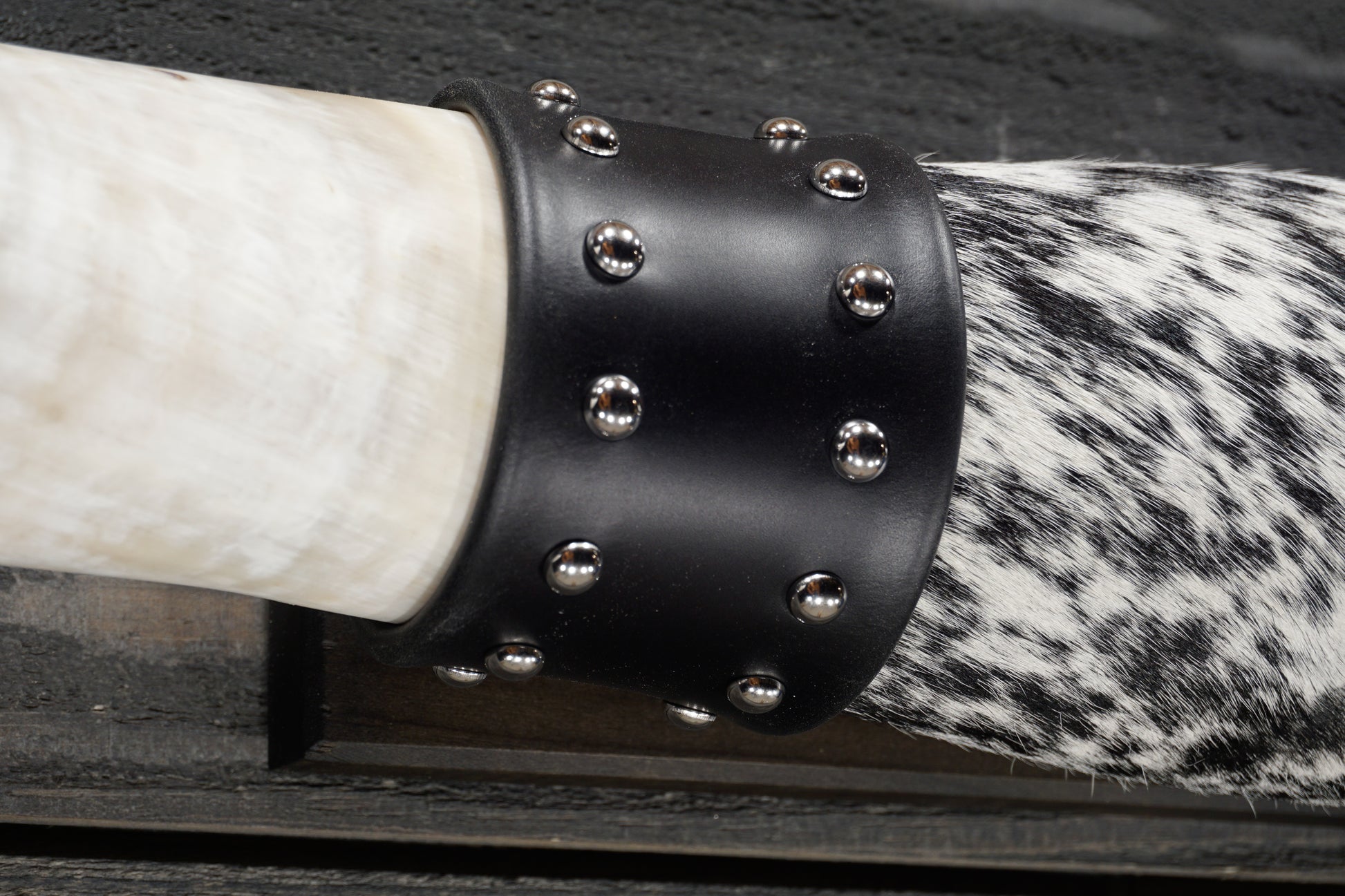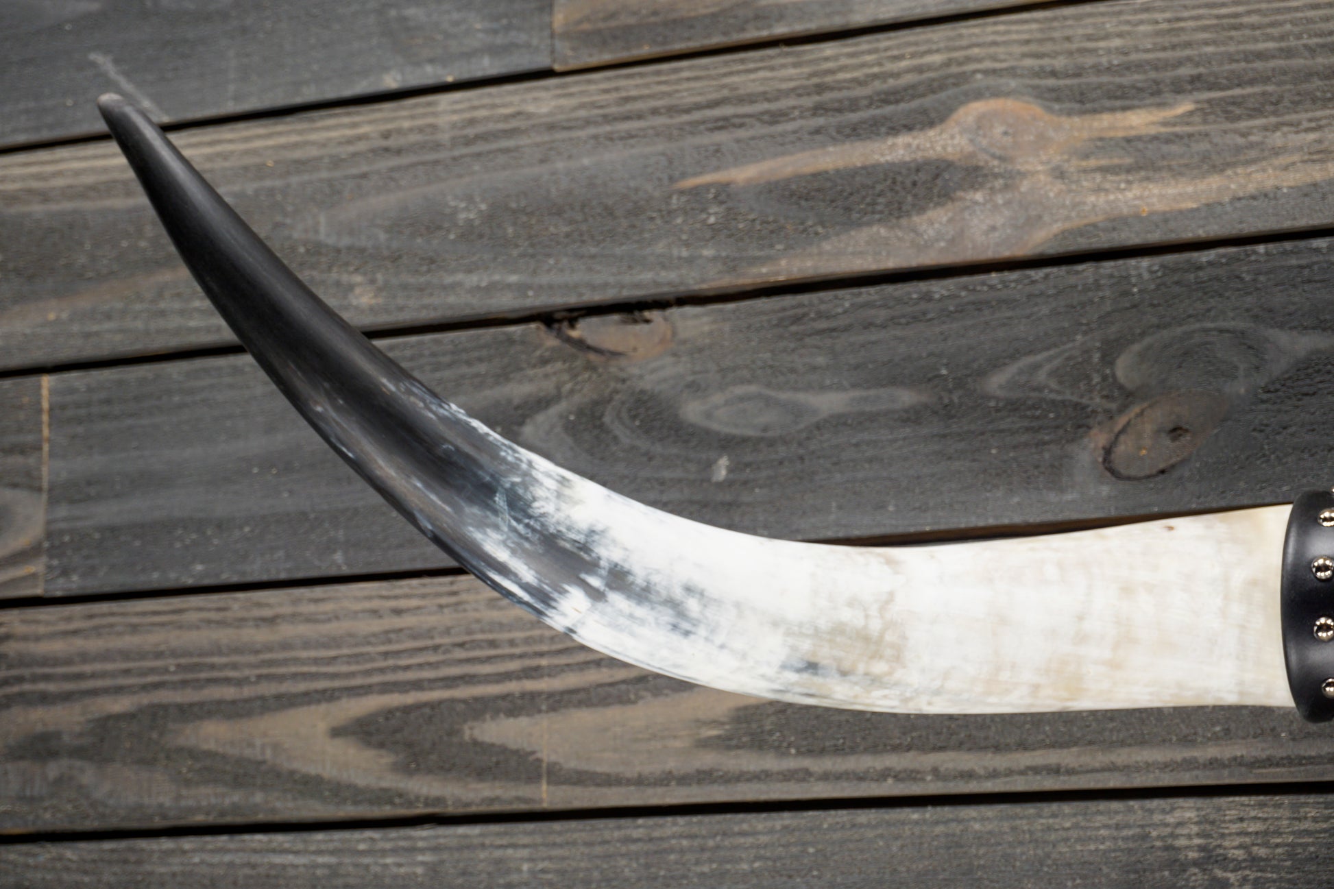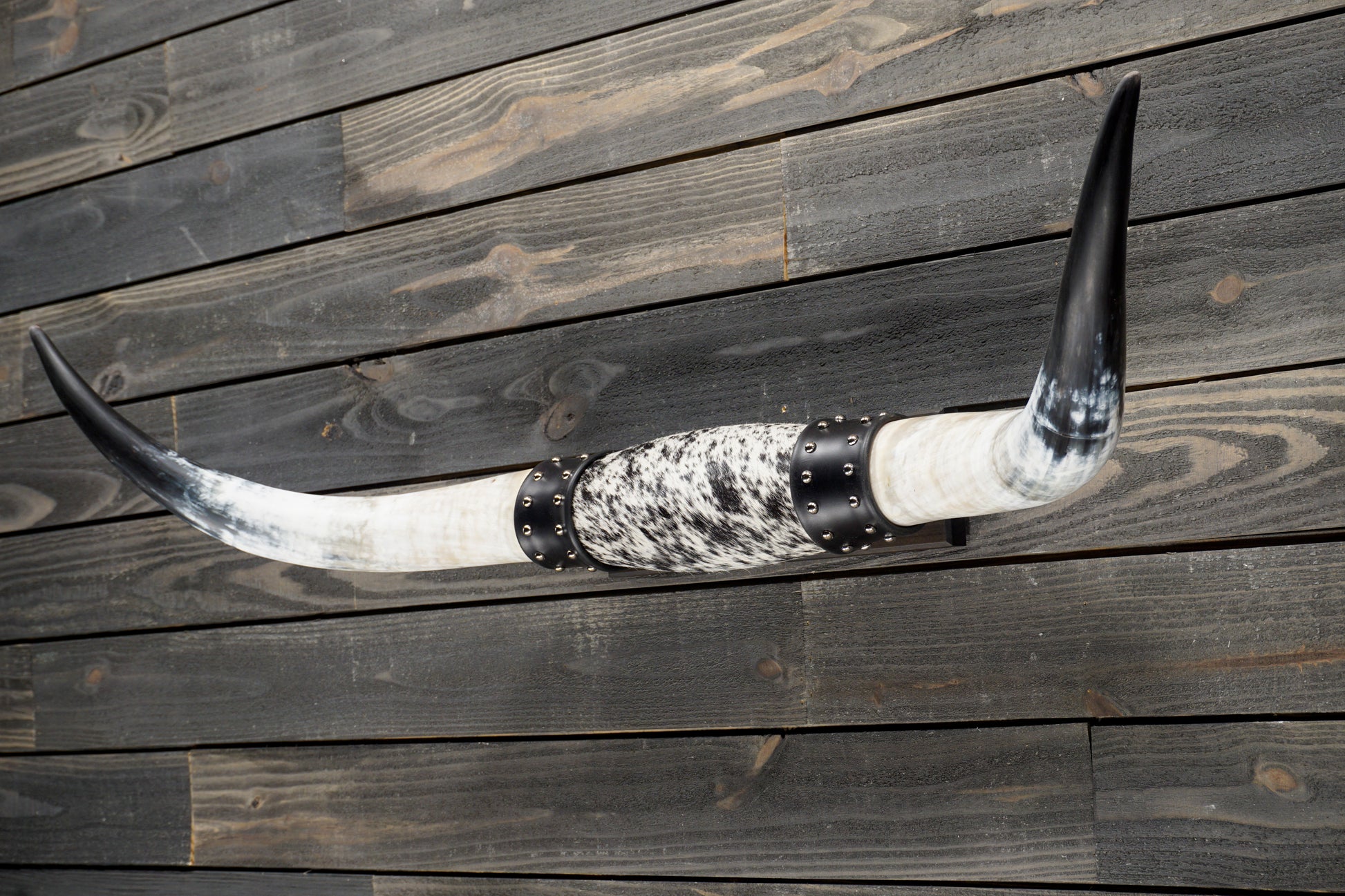 At 51 inches wide and each horn measuring 22 inches from tip to base, this set of black tipped horns are hand sanded and to a satin finish. The center is wrapped in white and black cowhide and black leather cuffs with nickel domed rivets. The mounting plaque is made of knotty alder with a black satin finish.