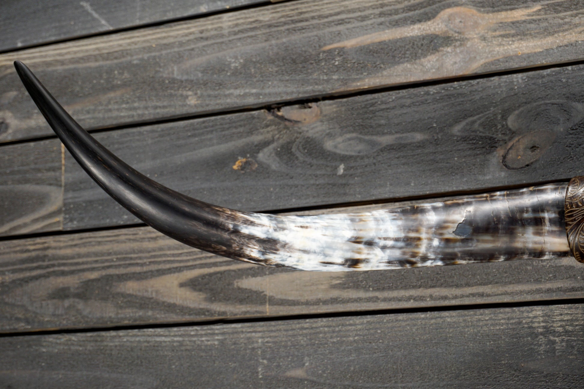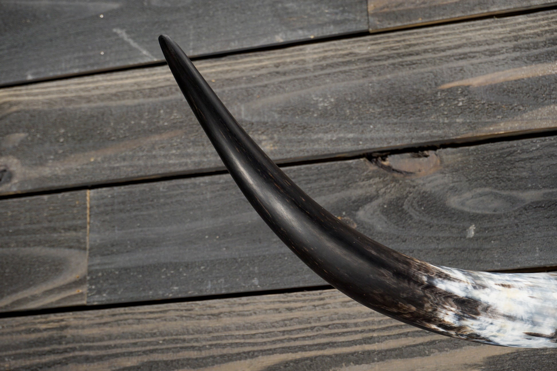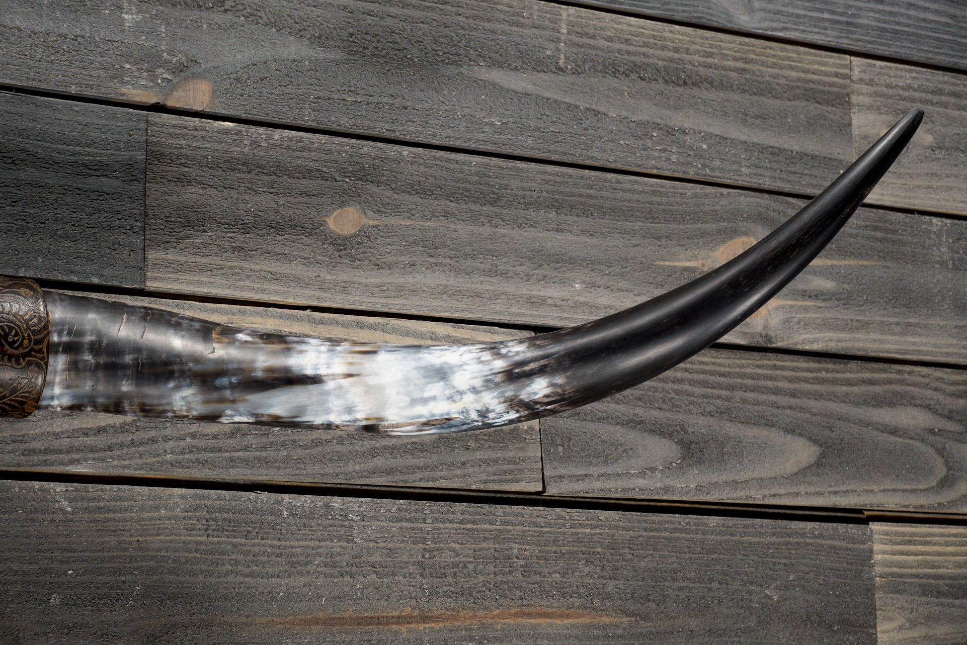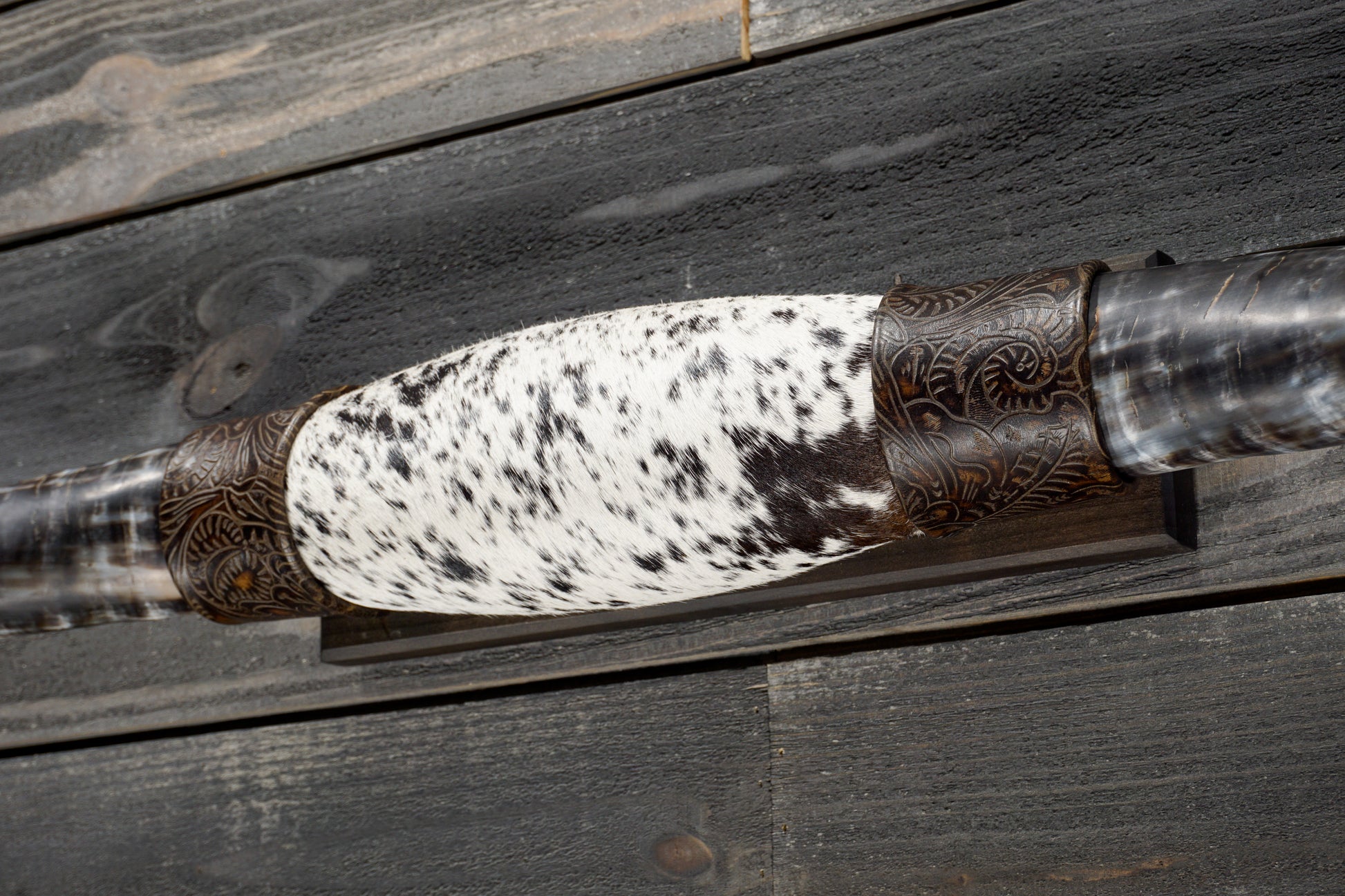 This pair of longhorns measures 53 inches wide tip to tip. Each horn measures 23 inches and are hand sanded to a satin finish. The center is wrapped in black and white speckled cowhide with dark brown western embossed leather.
