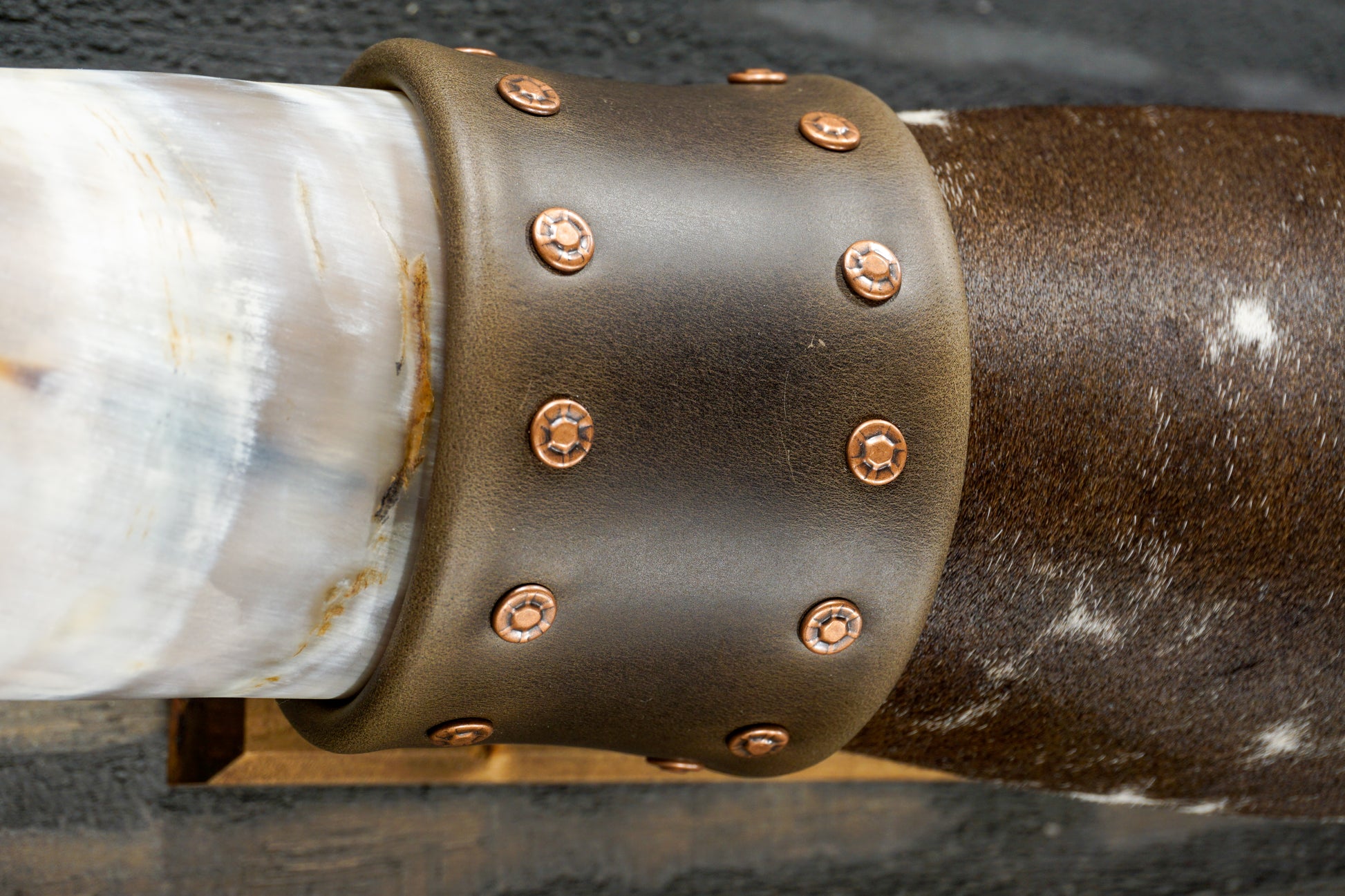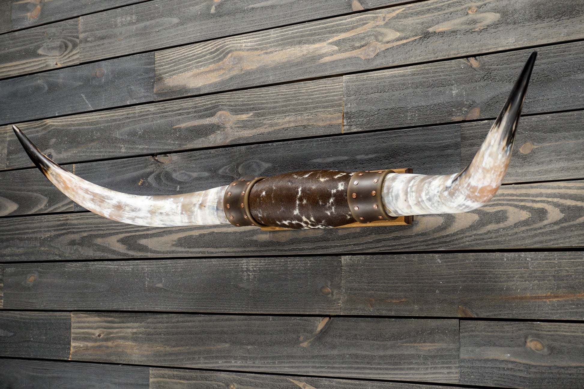 This set of longhorns measures 56 inches wide tip to tip. Each horn measures 23 inches and are hand sanded to a satin finish. The center is wrapped in brown and white speckled cowhide with dark brown leather trimmed with antique copper rivets.