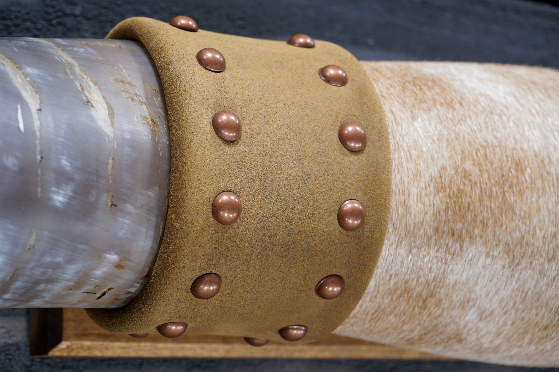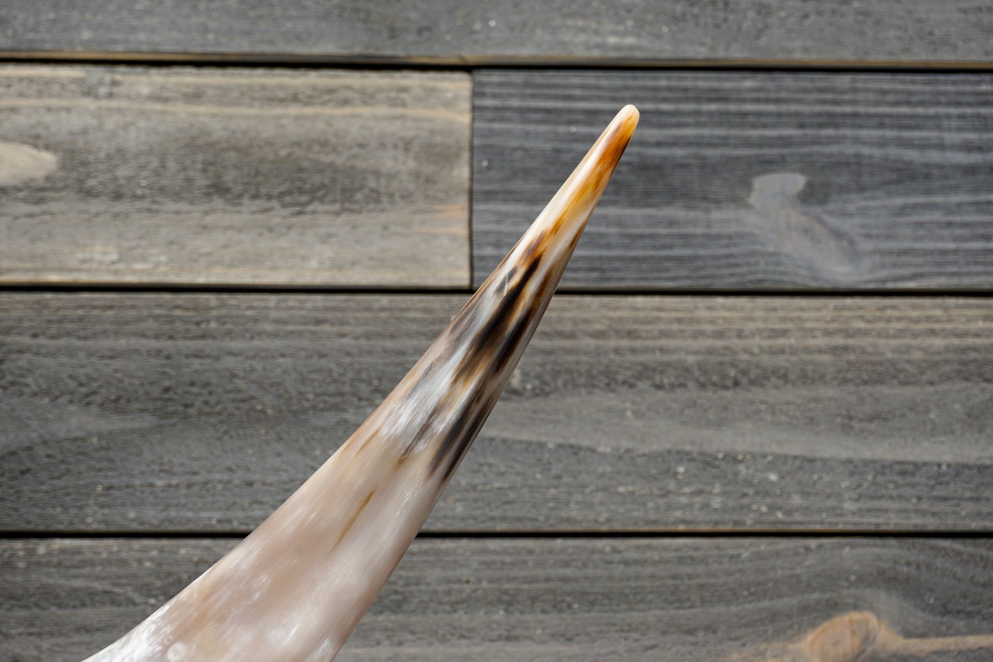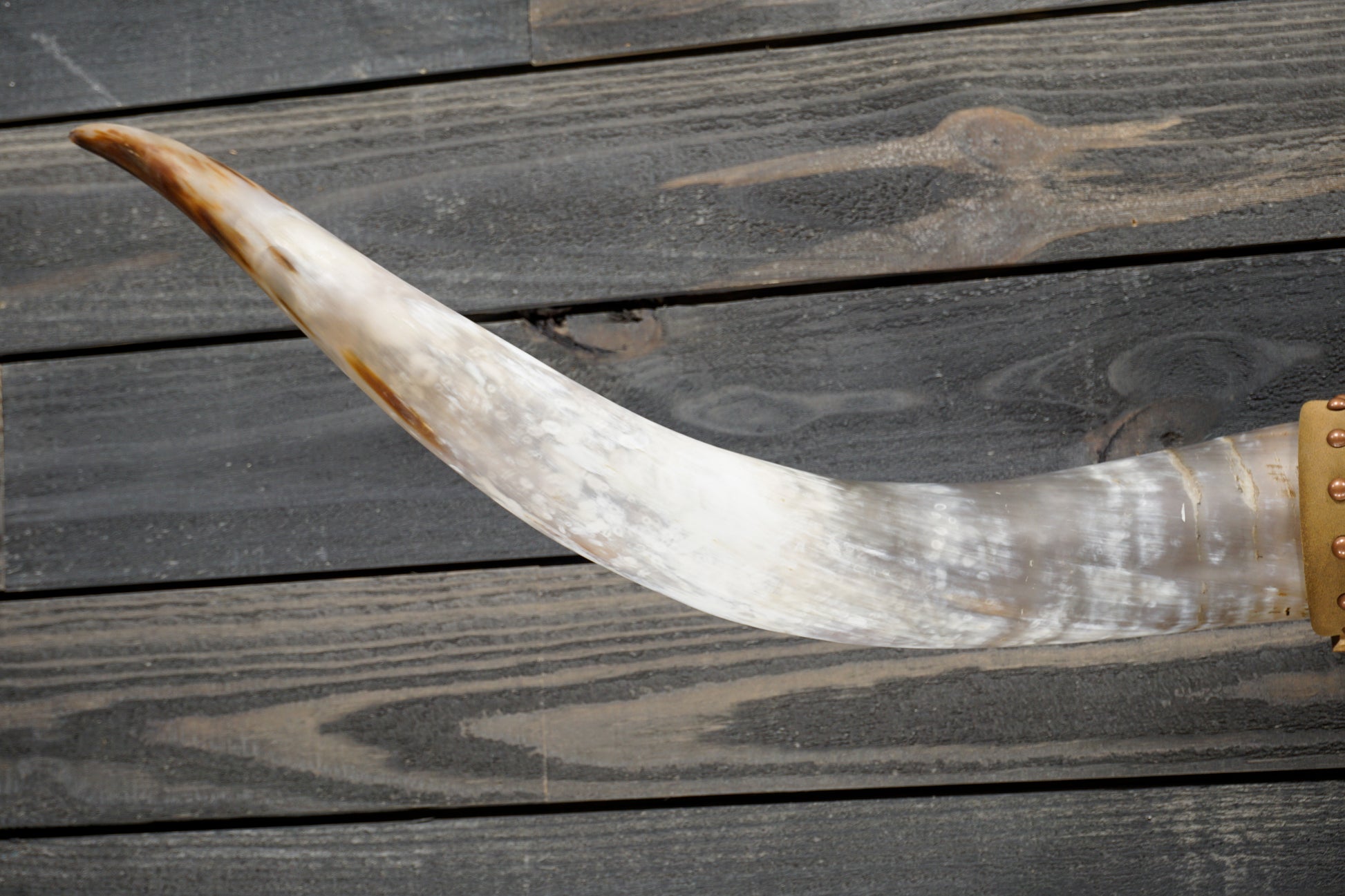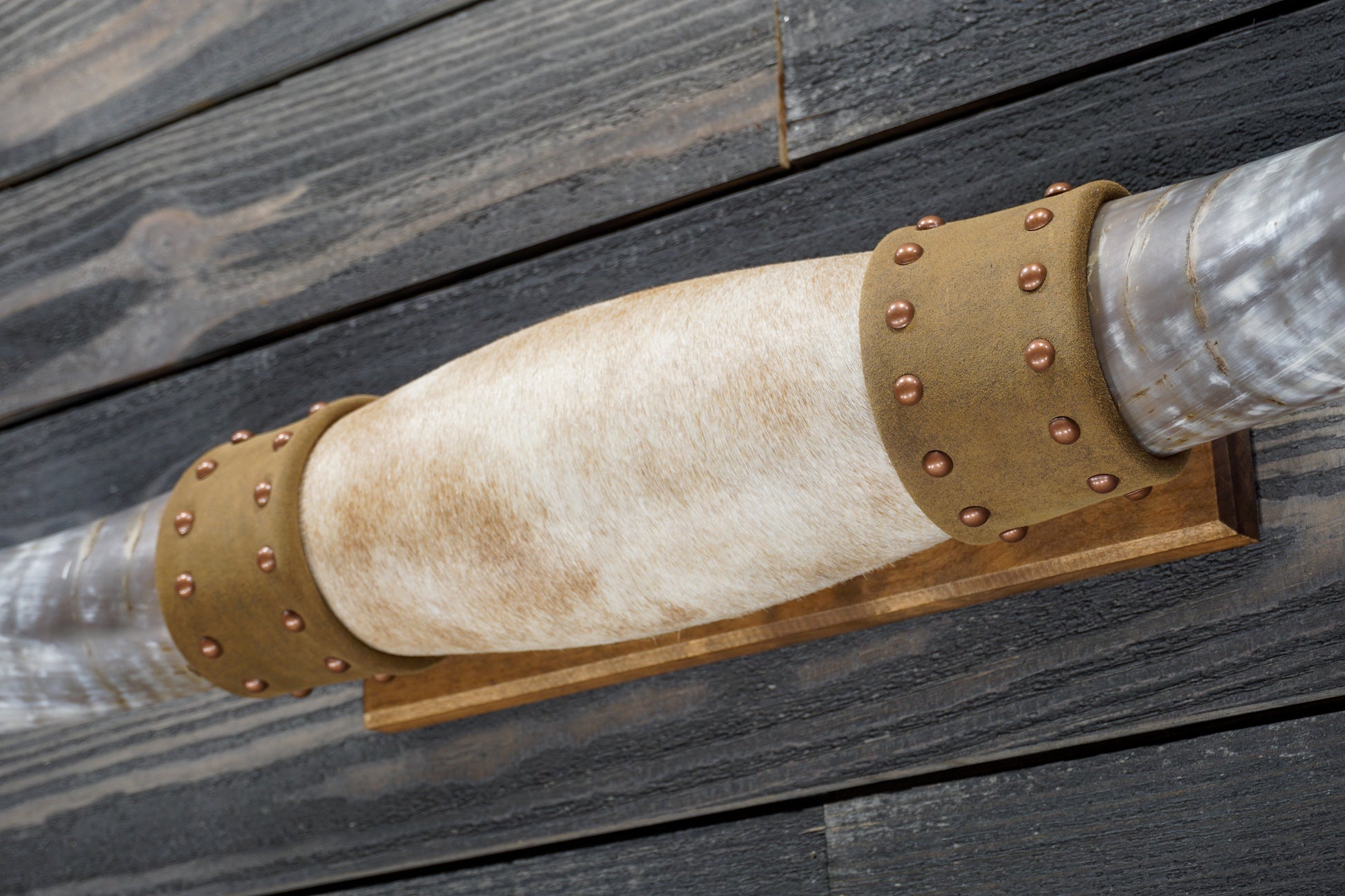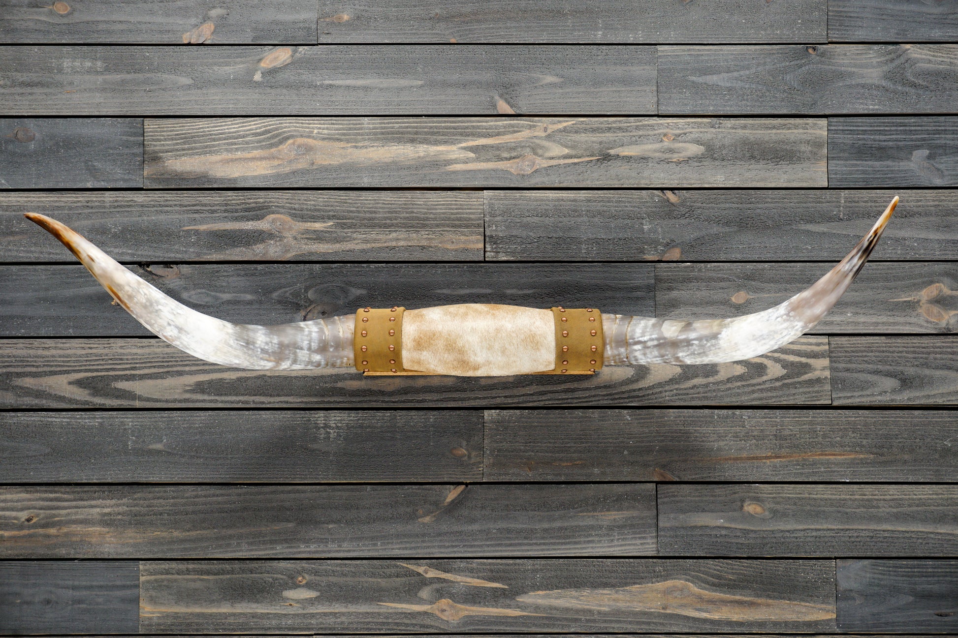 This set of longhorns measures 56 inches wide tip to tip. Each horn measures 24 inches and are hand sanded to a satin finish. The center is wrapped in white/tan cowhide and brown leather with antique copper rivets.