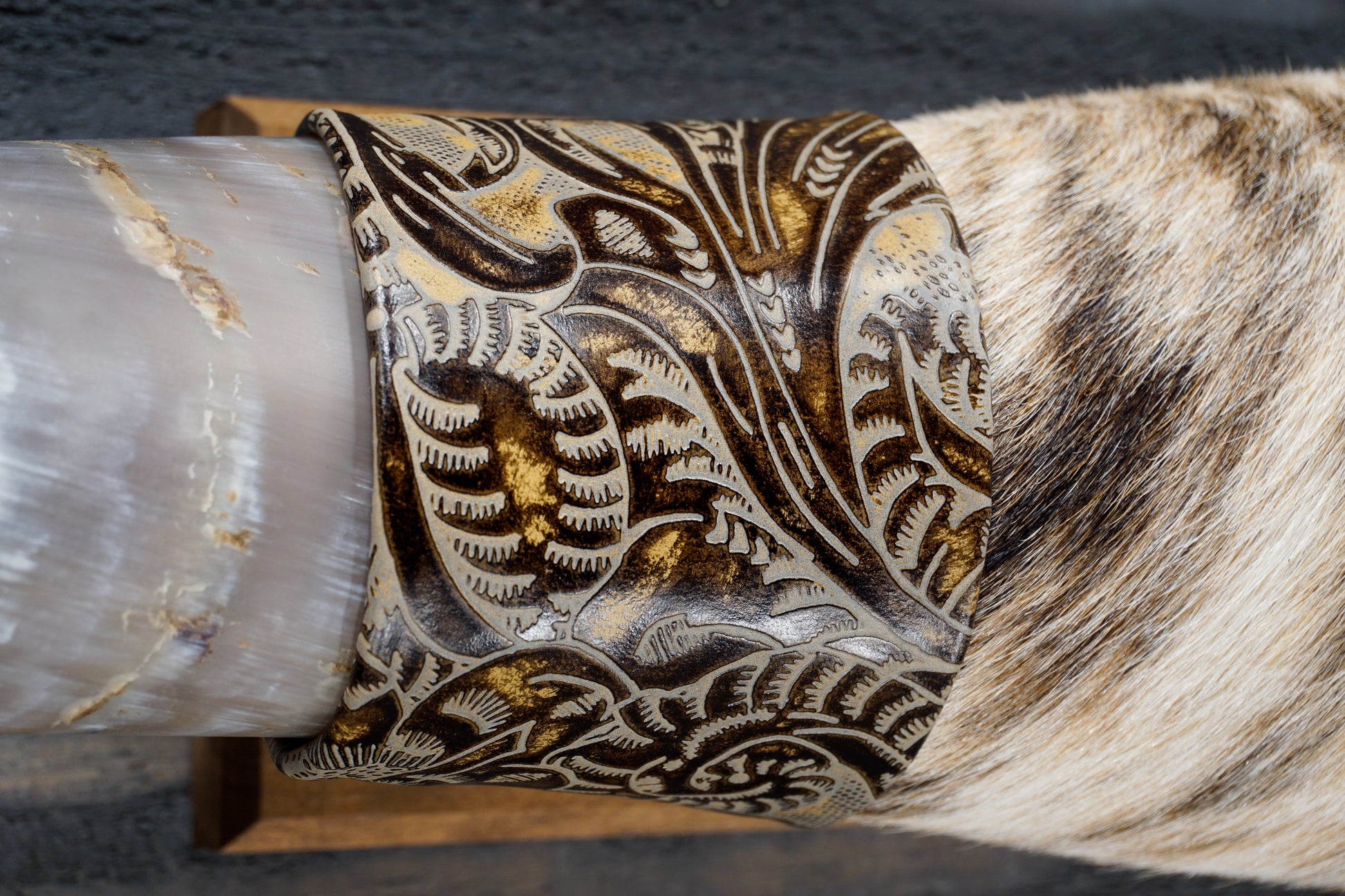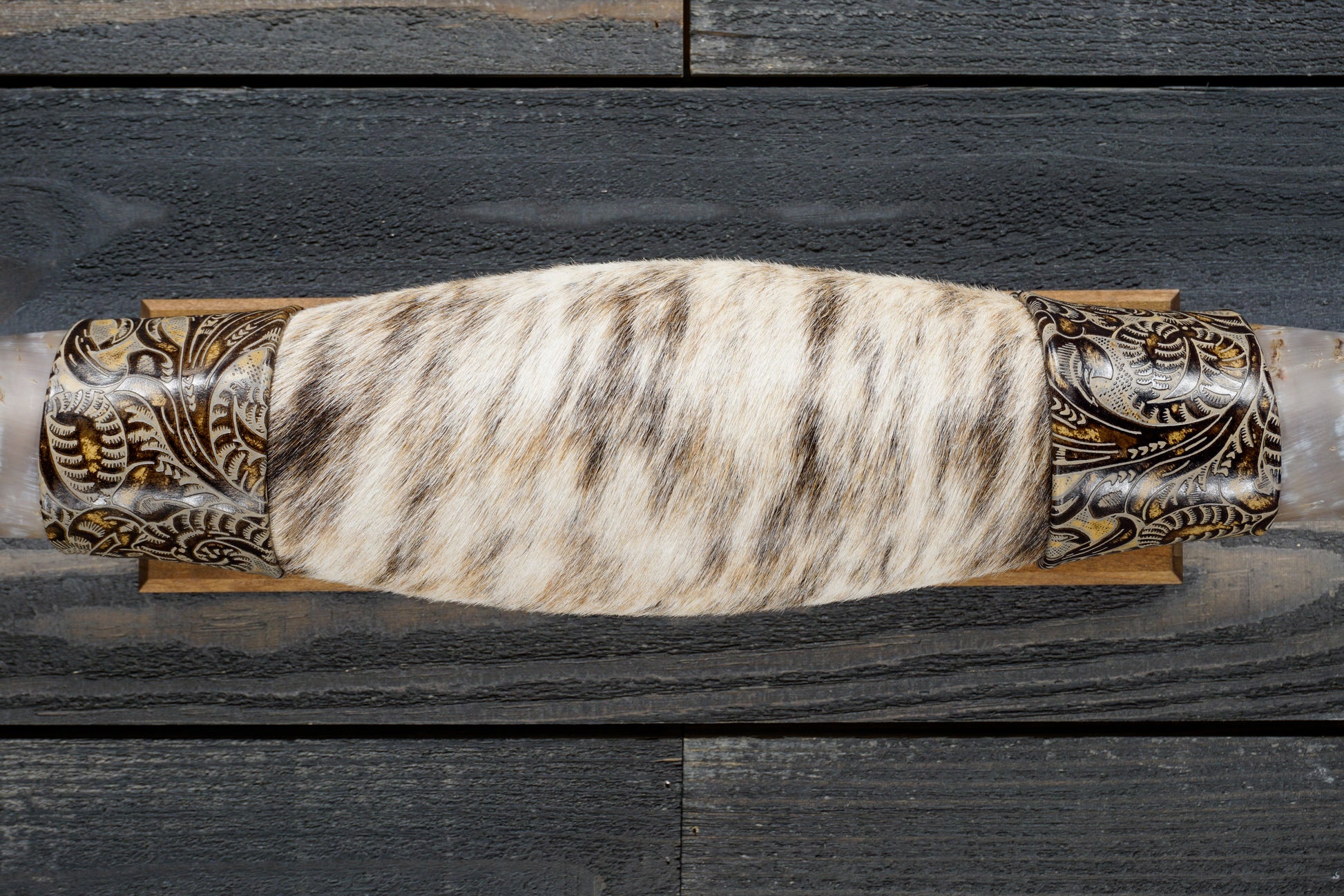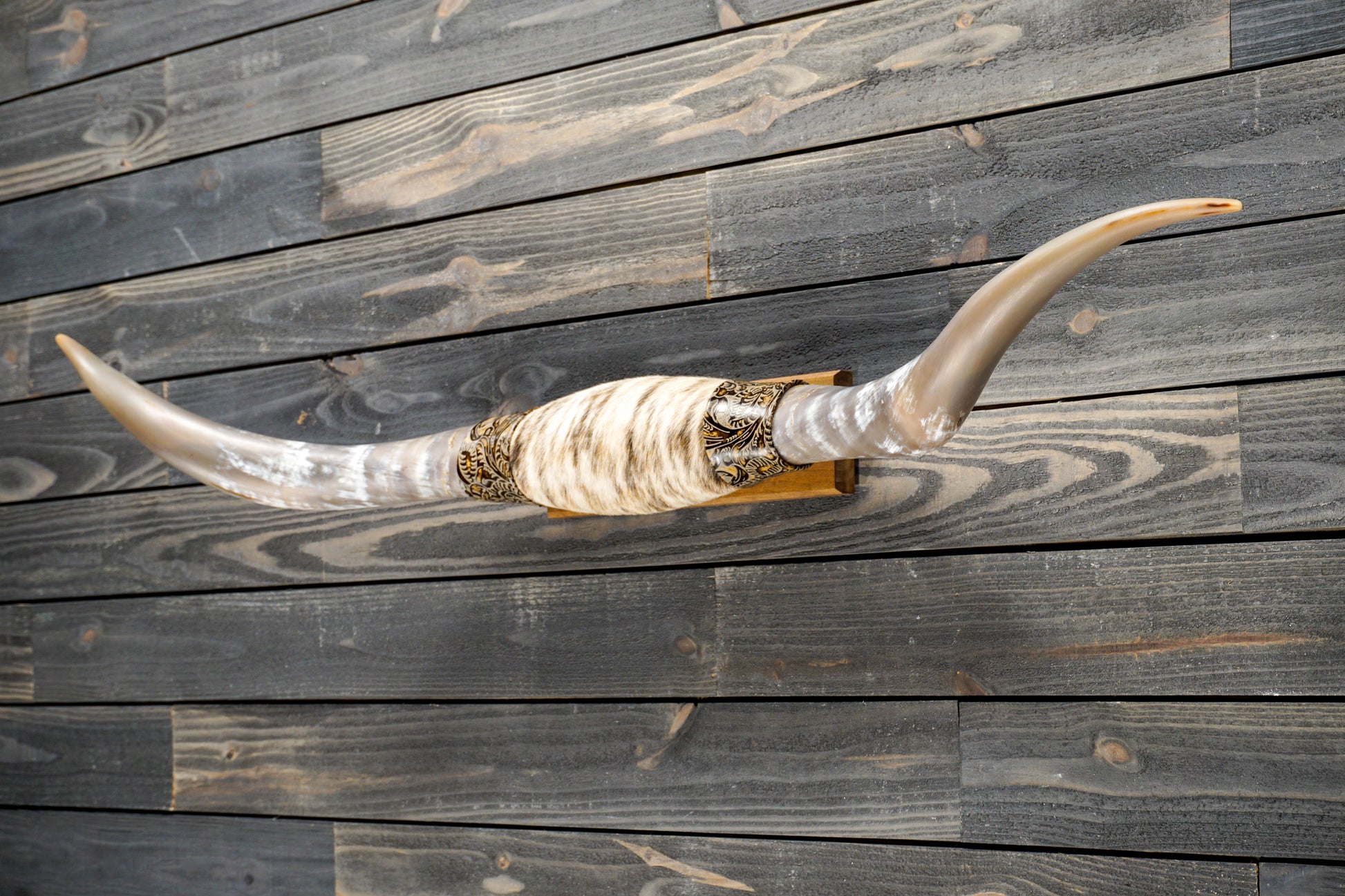 This set of longhorns measures 60 inches wide tip to tip. Each horn measures 24 inches and are hand sanded to a satin finish. The center is wrapped in white/brown brindle cowhide with brown western embossed leather.