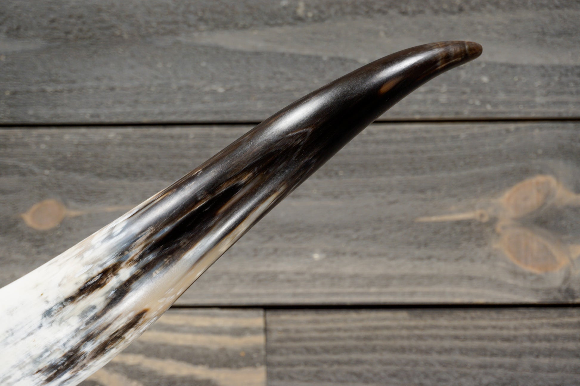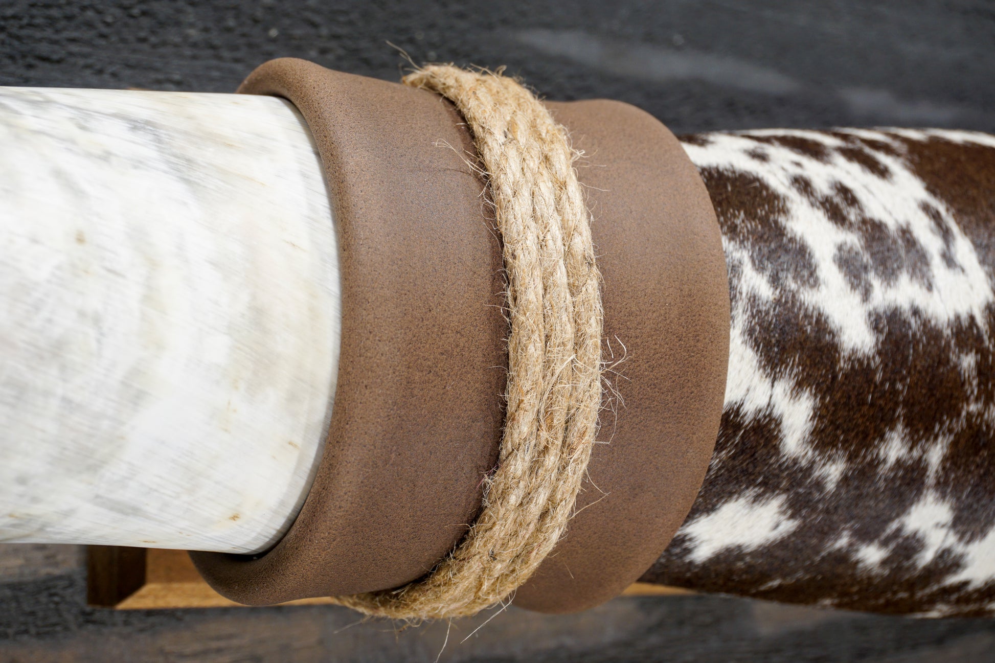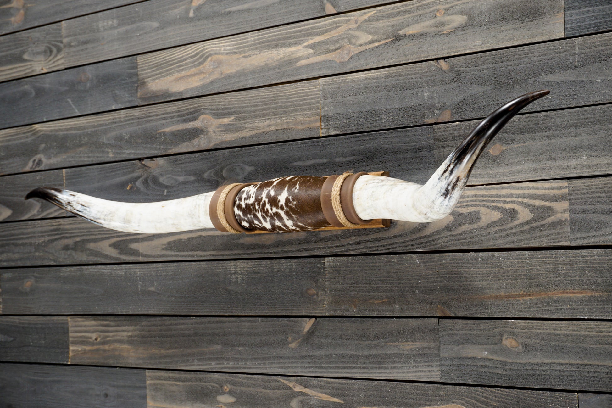 This set of longhorns measures 61 inches wide tip to tip. Each horn measures 24 and 26 inches and are hand sanded to a satin finish. The center is wrapped in brown and white longhorn cowhide with rustic brown leather trimmed with rope.