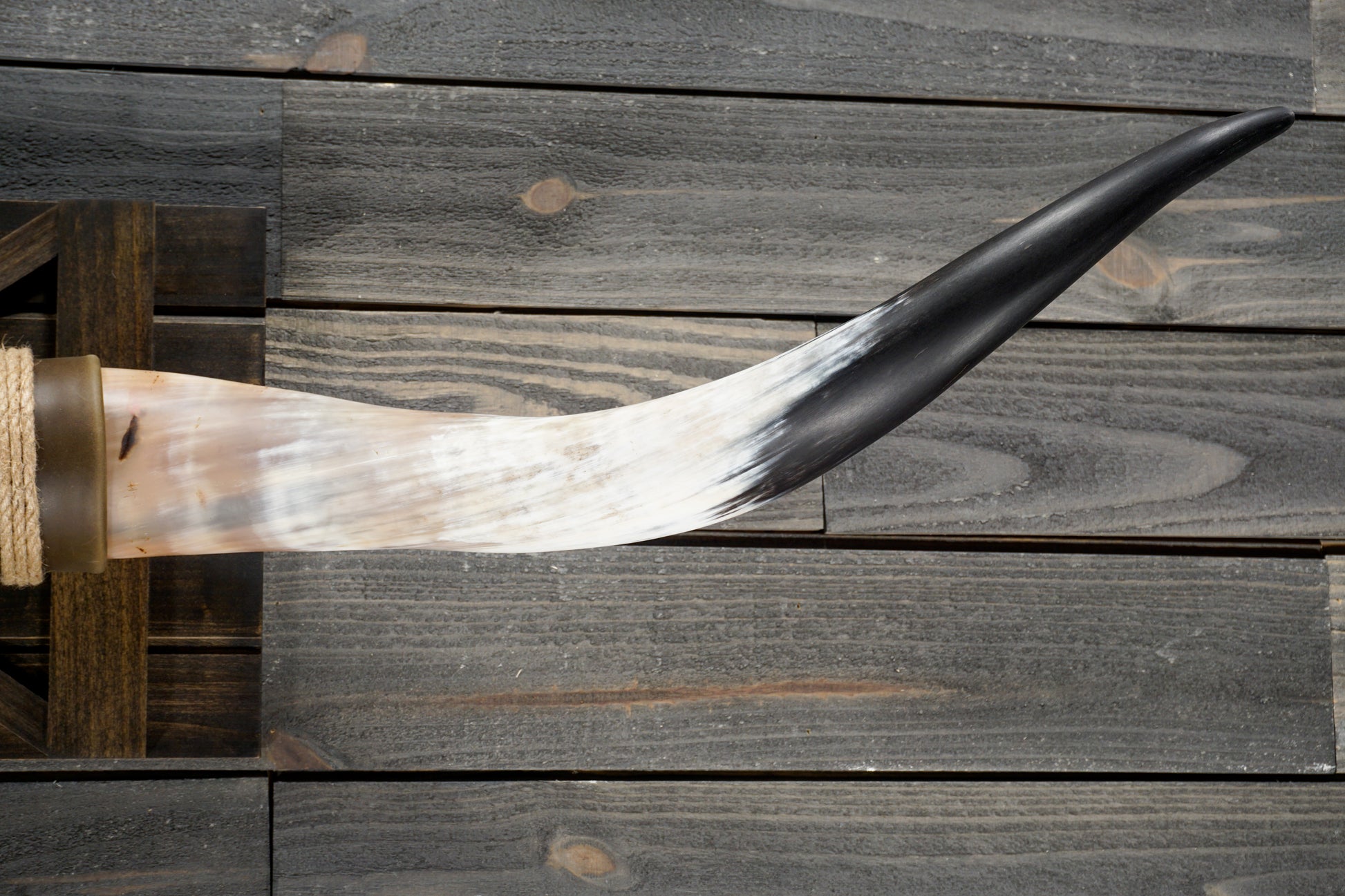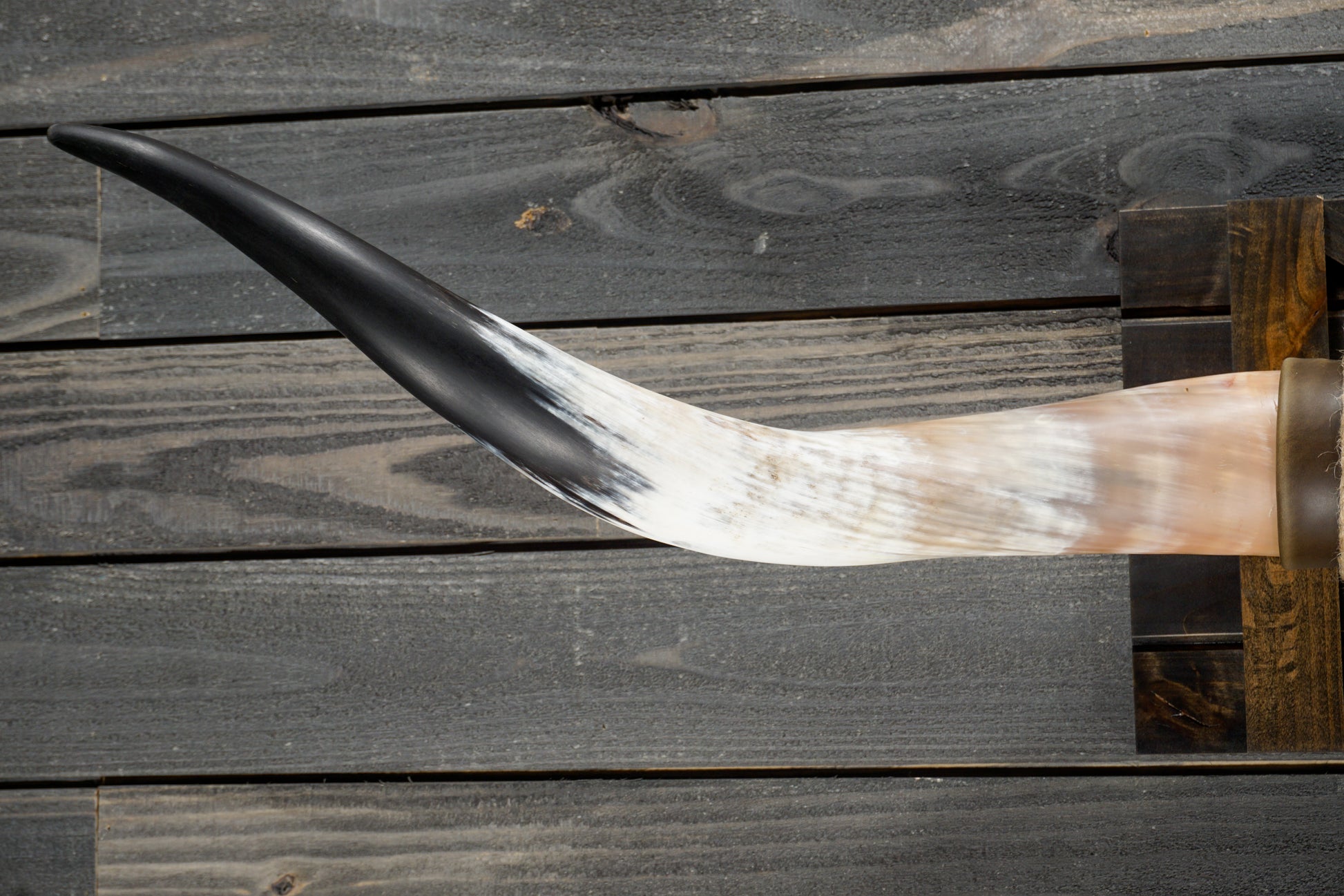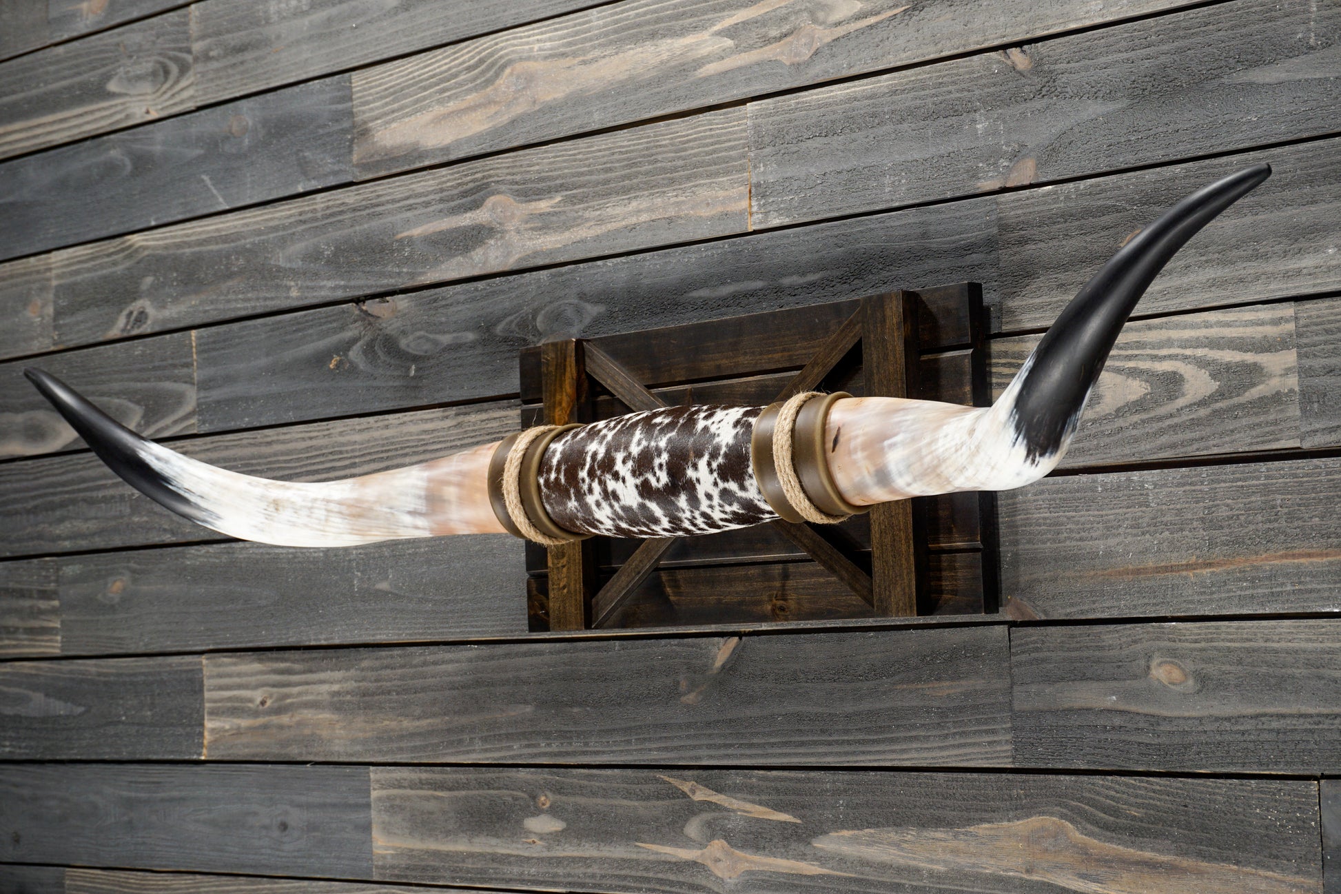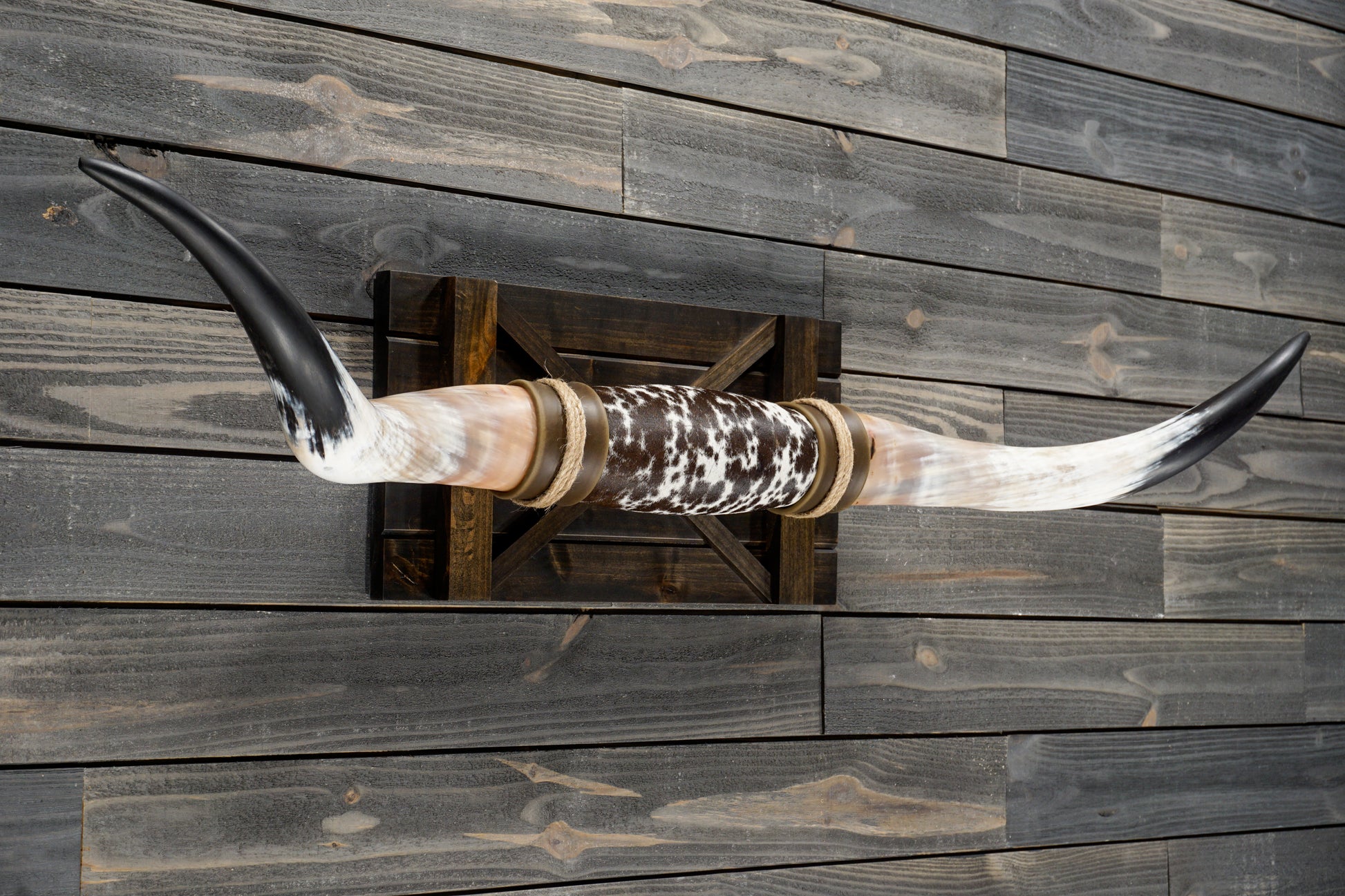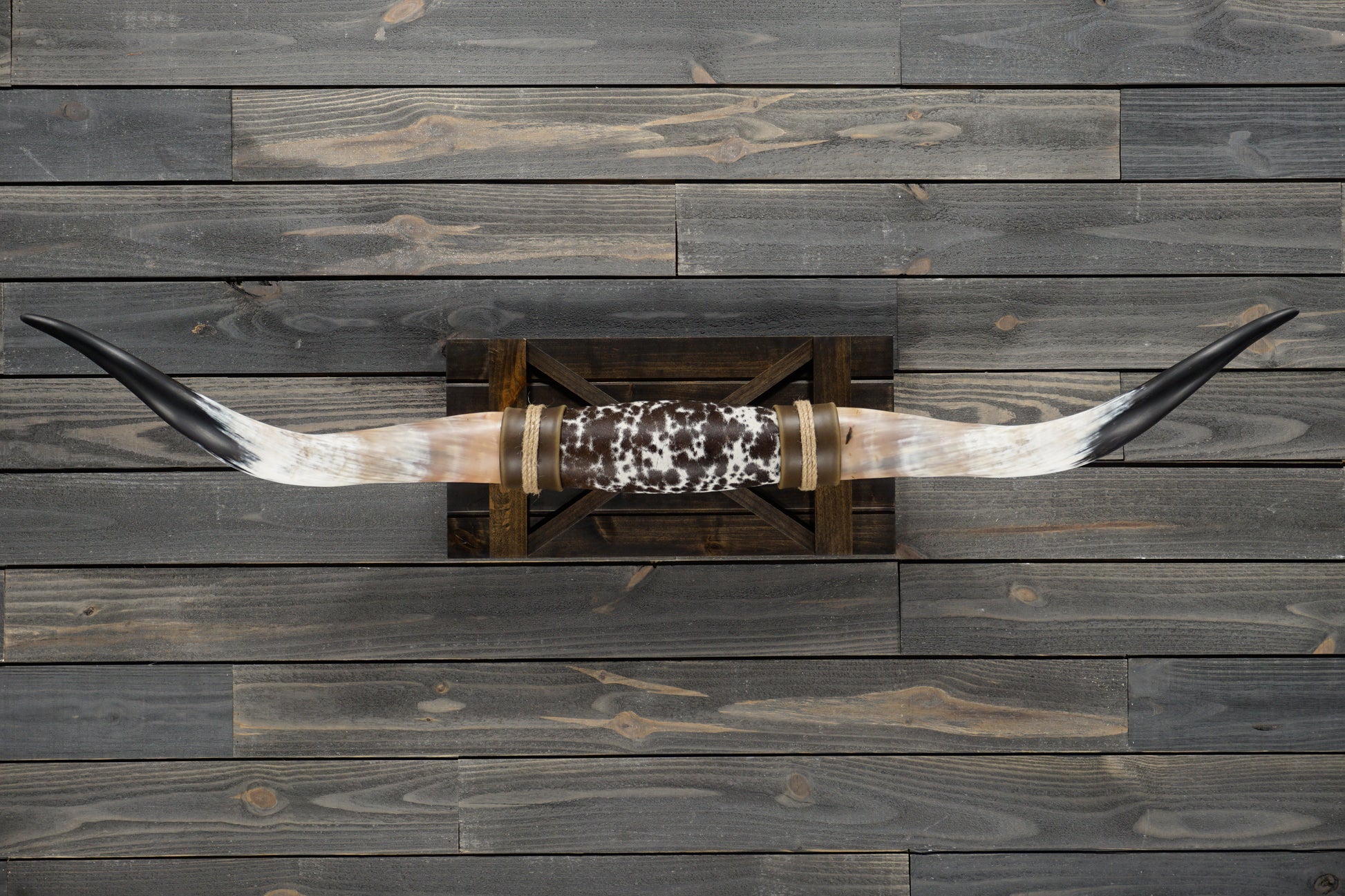 This set of longhorns measures 63 inches wide tip to tip. Each horn measures 26 inches and is hand sanded to a satin finish. The center is wrapped in dark brown speckled cowhide and dark brown leather trimmed with rope. The barn door style mounting plaque is made of knotty alder with a satin finish.
