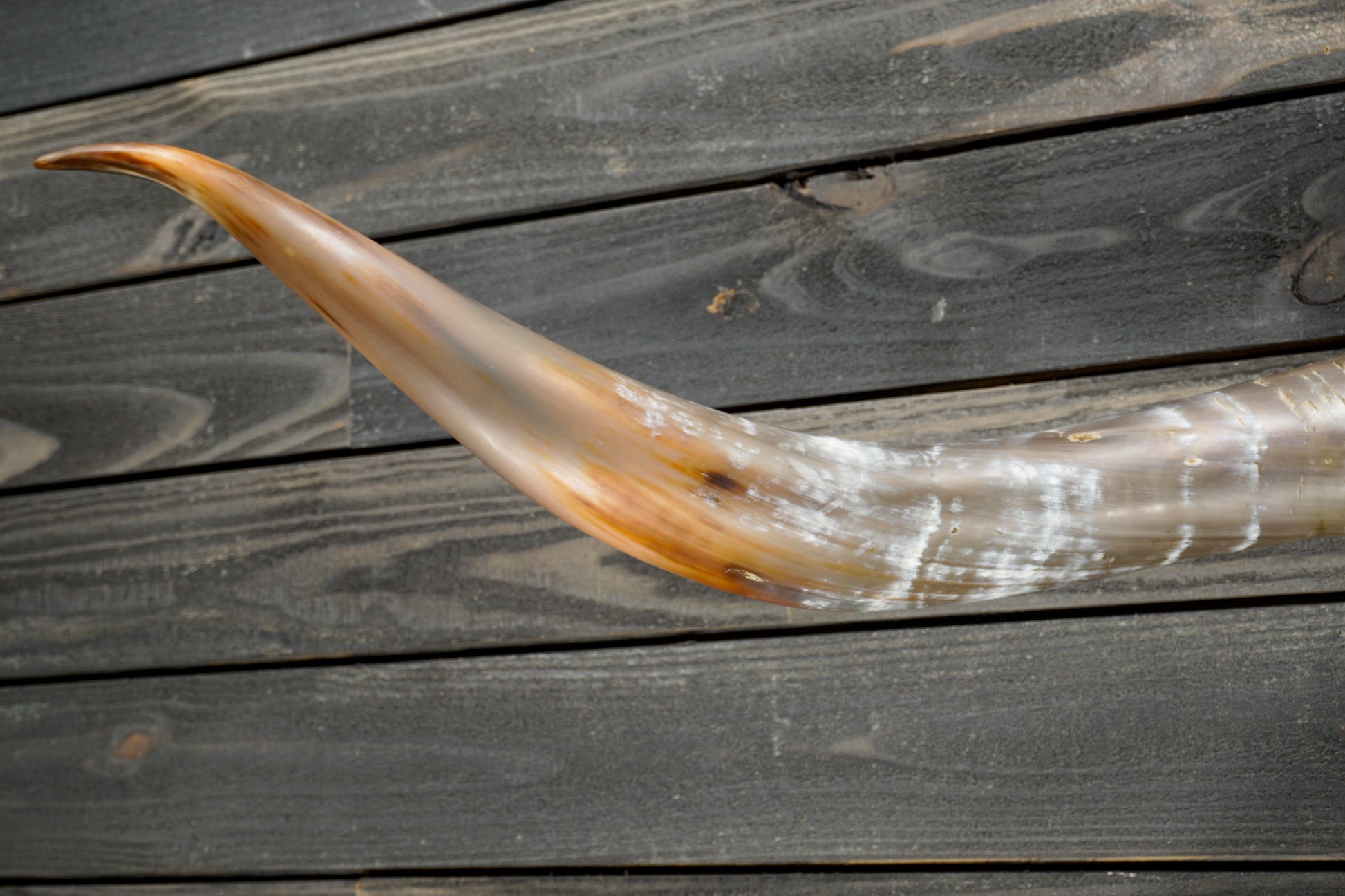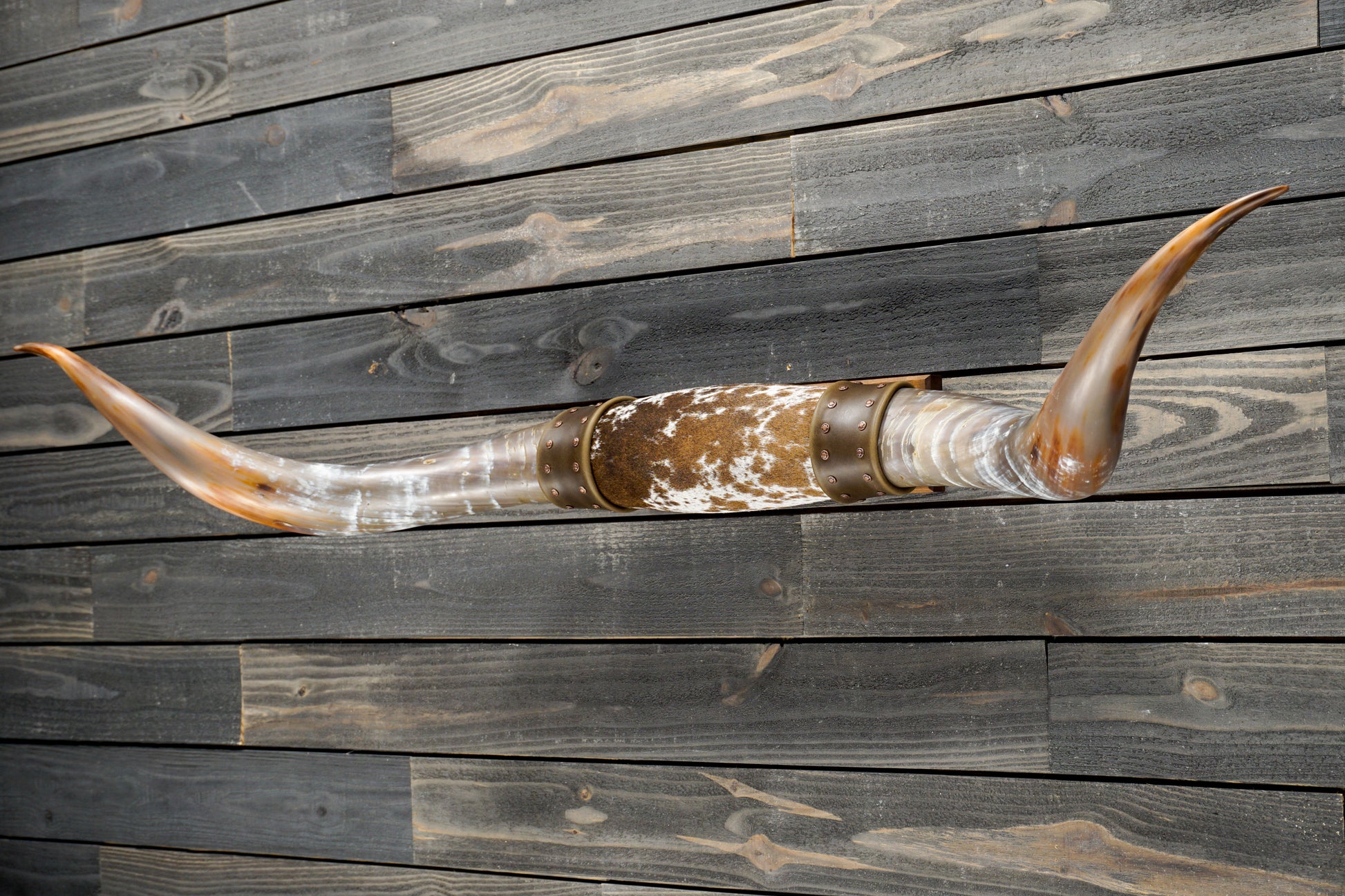 This set of longhorns measures 63 inches wide tip to tip. Each horn measures 27 inches and are hand sanded to a satin finish. The center is wrapped in brown and white speckled cowhide with dark brown leather trimmed with antique copper rivets.