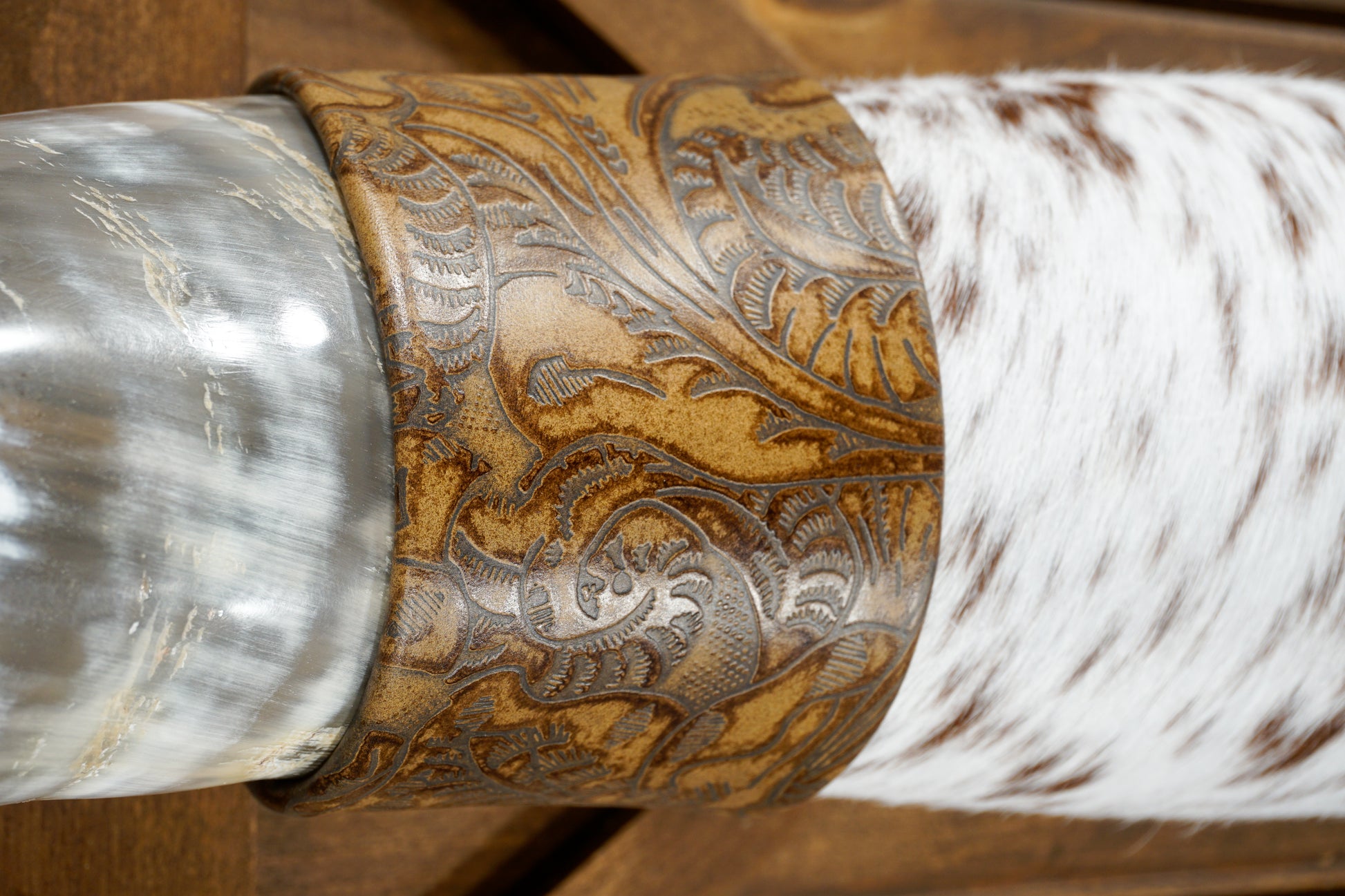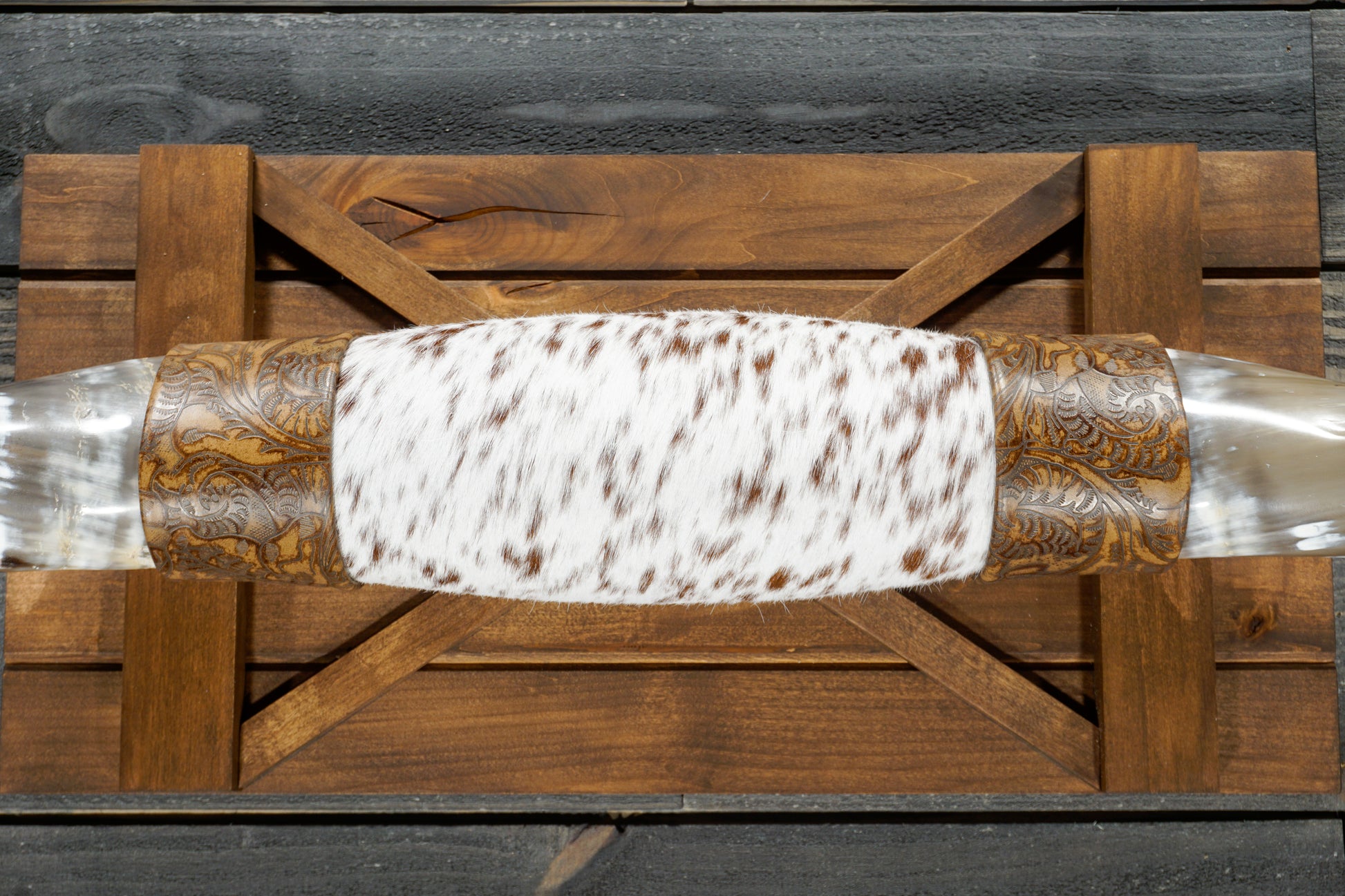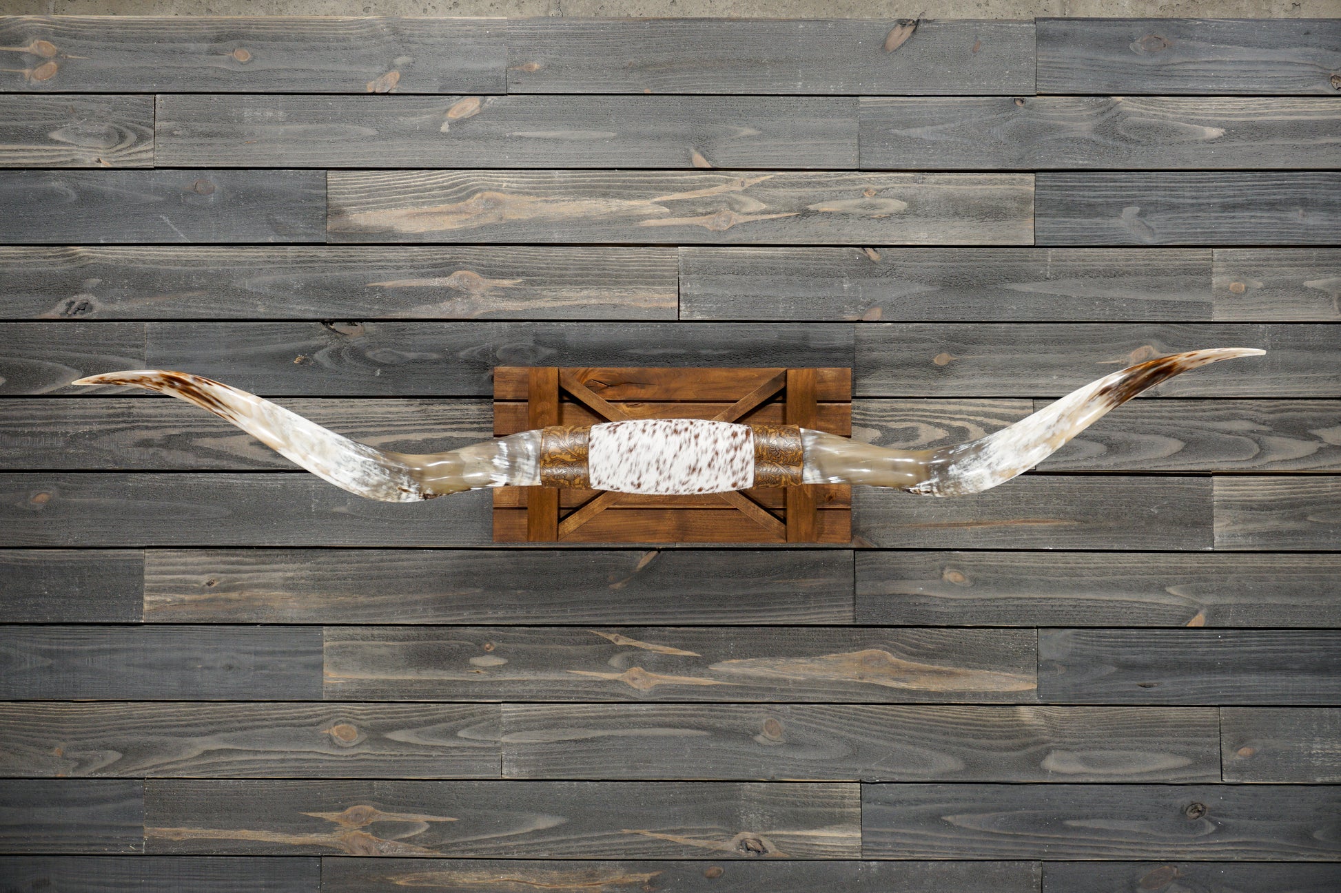 This set of longhorns measures 72 inches wide tip to tip. Each horn measures 31 inches and are hand sanded to a gloss finish. The center is wrapped in brown and white speckled cowhide with brown western embossed leather. The barn door style mounting plaque is made of knotty alder with a satin finish.